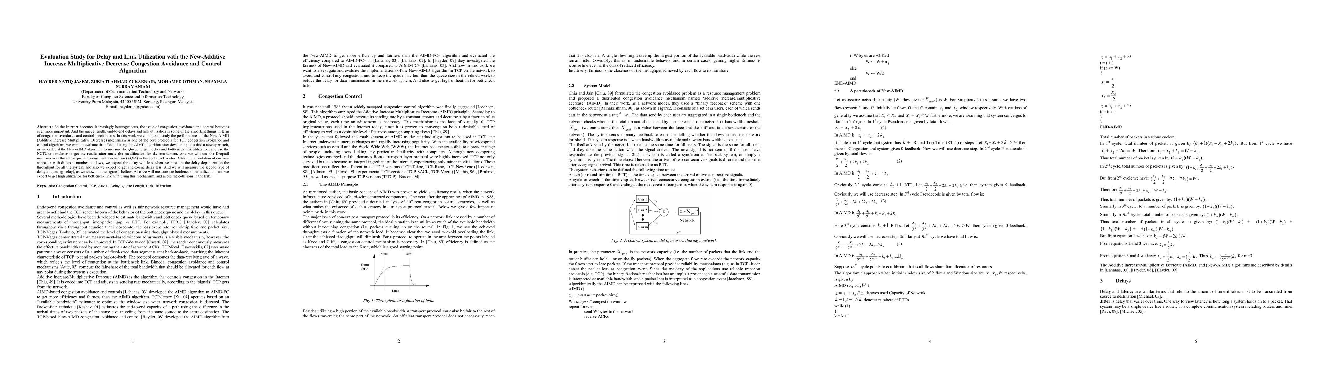 This study evaluates the New-AIMD congestion avoidance and control algorithm's performance in terms of queue length, end-to-end delay, and link utilization. The research aims to demonstrate reduced delay and improved bottleneck link utilization compared to traditional AIMD, using the NCTUns simulator and Droptail mechanism.