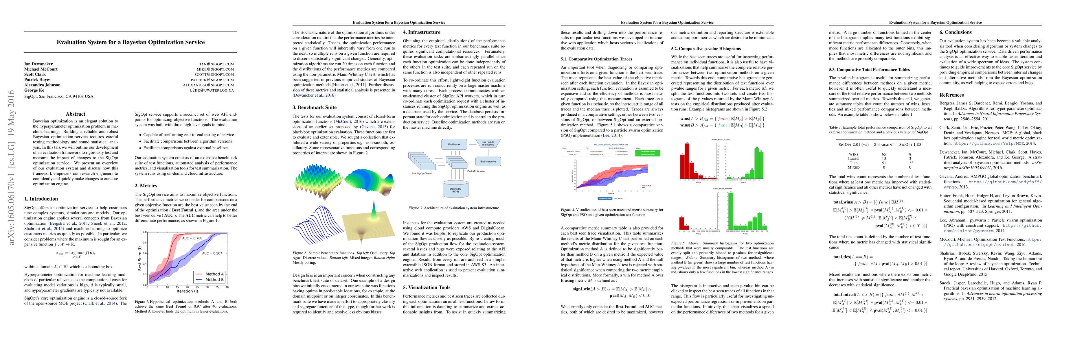 Bayesian optimization is an elegant solution to the hyperparameter optimization problem in machine learning. Building a reliable and robust Bayesian optimization service requires careful testing methodology and sound statistical analysis. In this talk we will outline our development of an evaluation framework to rigorously test and measure the impact of changes to the SigOpt optimization service. We present an overview of our evaluation system and discuss how this framework empowers our research engineers to confidently and quickly make changes to our core optimization engine