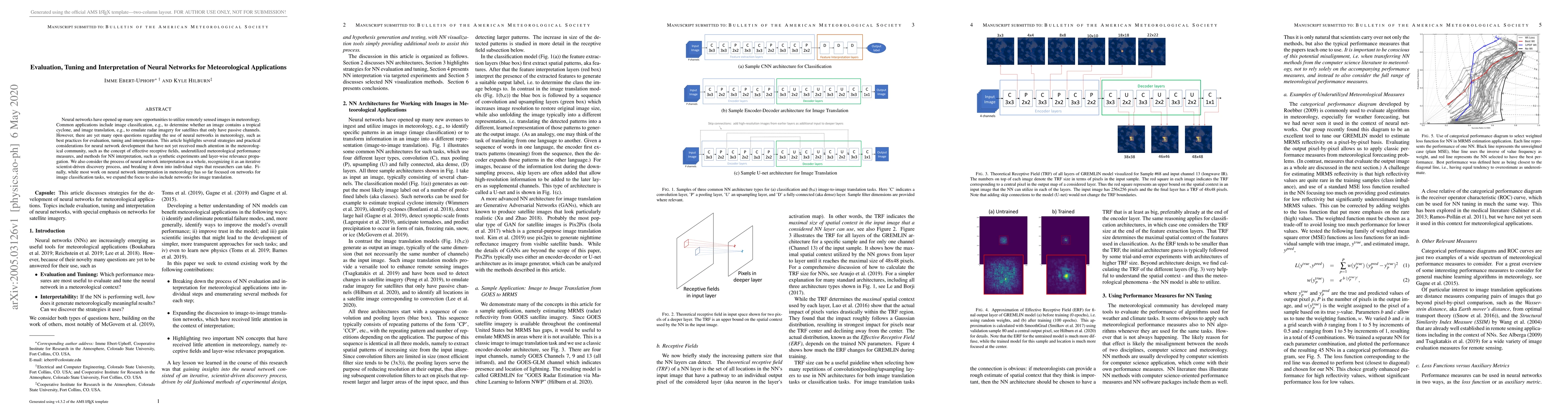 This paper provides practical considerations for developing neural networks in meteorology, including strategies for evaluation, tuning, interpretation, and synthetic experiments to improve performance and understanding.