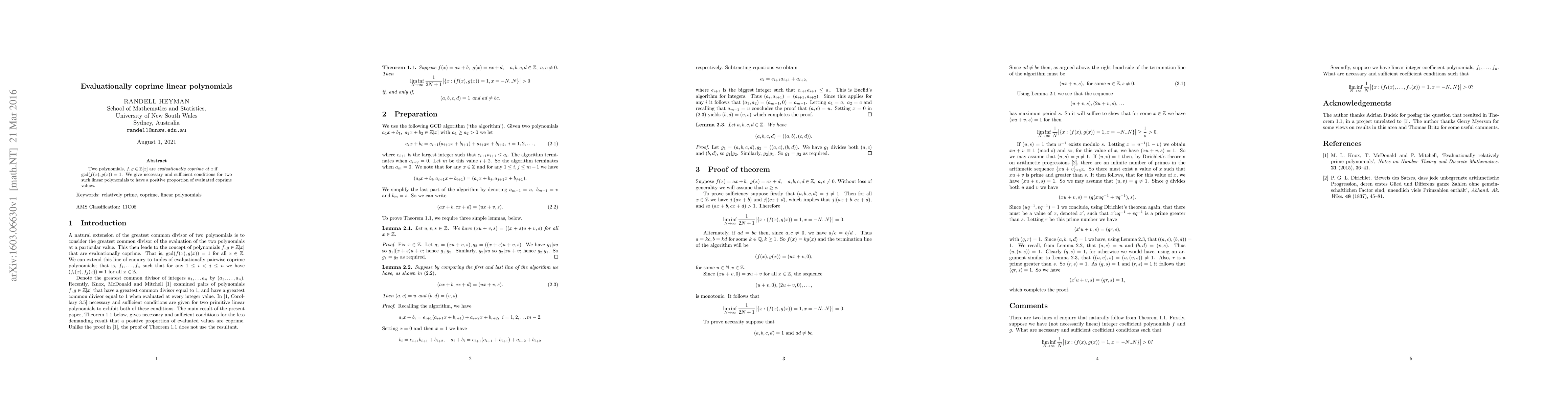 This paper investigates linear polynomials in $\mathbb{Z}[x]$ that are evaluationally coprime, meaning their greatest common divisor equals 1 when evaluated at any integer. The authors provide necessary and sufficient conditions for such polynomials to have a positive proportion of coprime evaluated values.