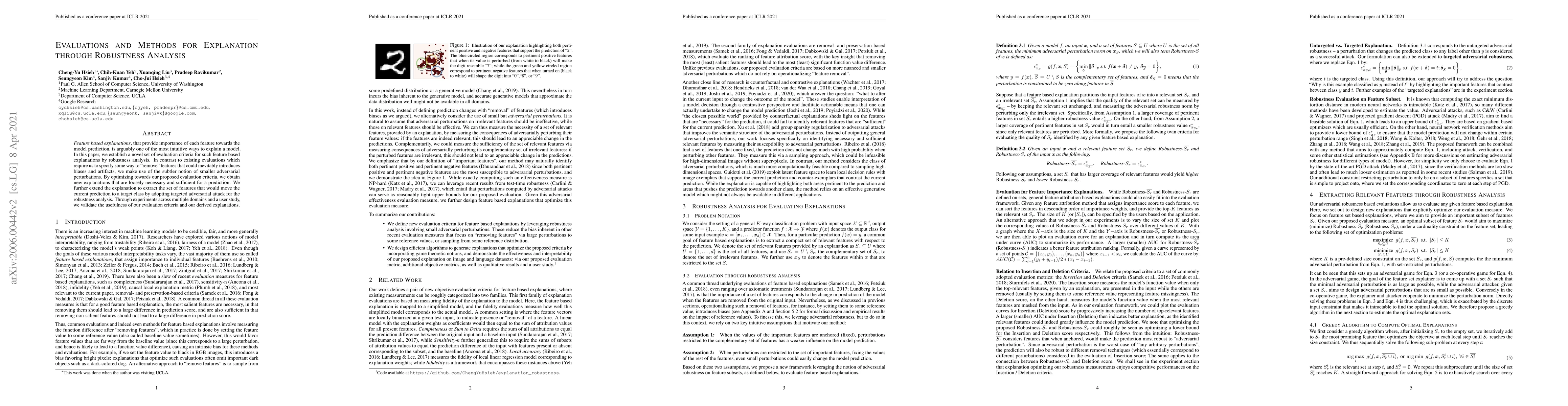 Feature based explanations, that provide importance of each feature towards the model prediction, is arguably one of the most intuitive ways to explain a model. In this paper, we establish a novel set of evaluation criteria for such feature based explanations by robustness analysis. In contrast to existing evaluations which require us to specify some way to "remove" features that could inevitably introduces biases and artifacts, we make use of the subtler notion of smaller adversarial perturbations. By optimizing towards our proposed evaluation criteria, we obtain new explanations that are loosely necessary and sufficient for a prediction. We further extend the explanation to extract the set of features that would move the current prediction to a target class by adopting targeted adversarial attack for the robustness analysis. Through experiments across multiple domains and a user study, we validate the usefulness of our evaluation criteria and our derived explanations.