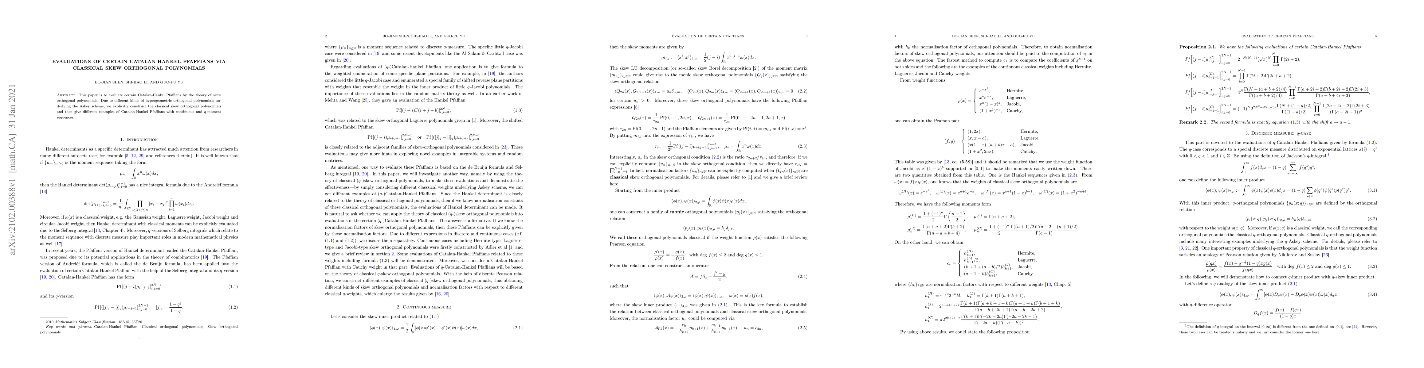 This paper evaluates Catalan-Hankel Pfaffians using classical skew orthogonal polynomials, explicitly constructing these polynomials based on various hypergeometric orthogonal polynomials and providing examples with continuous and $q$-moment sequences.