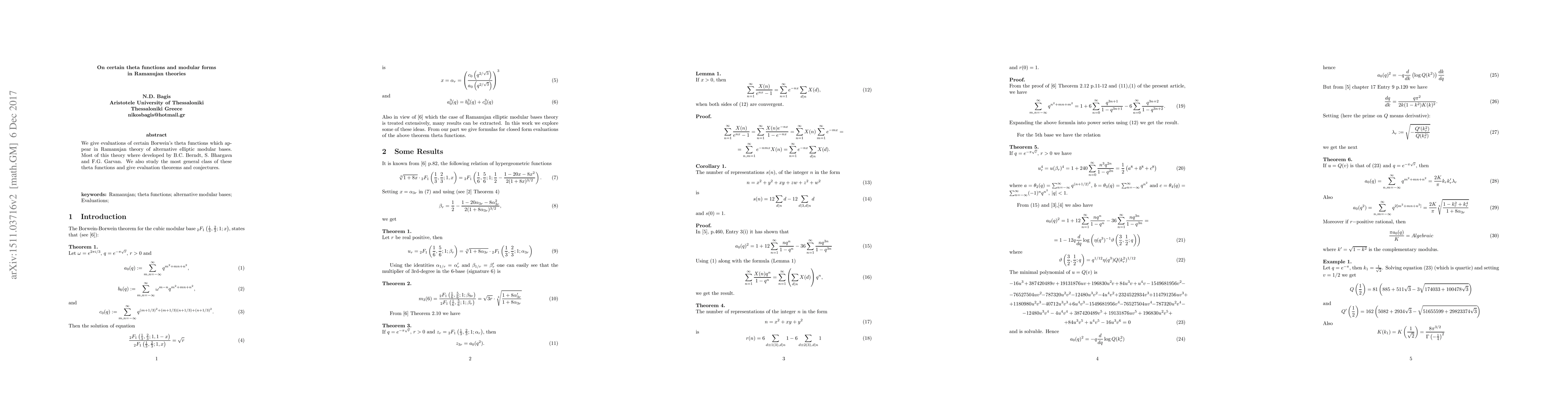 We give evaluations of certain Borwein's theta functions which appear in Ramanujan theory of alternative elliptic modular bases. Most of this theory where developed by B.C. Berndt, S. Bhargava and F.G. Garvan. We also study the most general class of these theta functions and give evaluation theorems and conjectures.