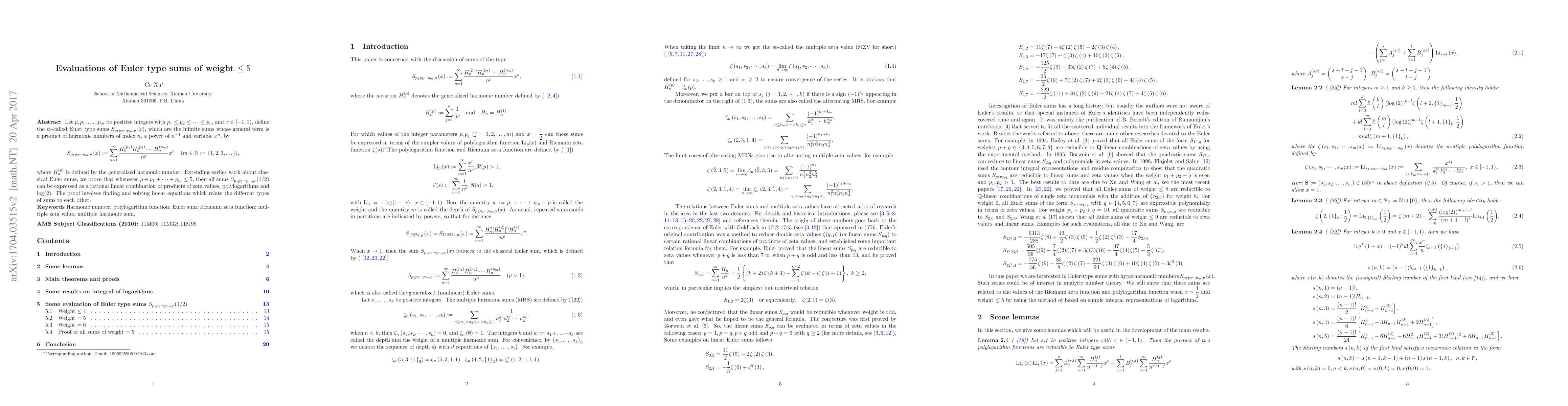 This paper evaluates Euler type sums of weight $\leq$ 5, showing that sums evaluated at $x=1/2$ can be expressed as rational linear combinations of zeta values, polylogarithms, and $\log(2)$. The proof relies on solving linear equations that relate different types of these sums.