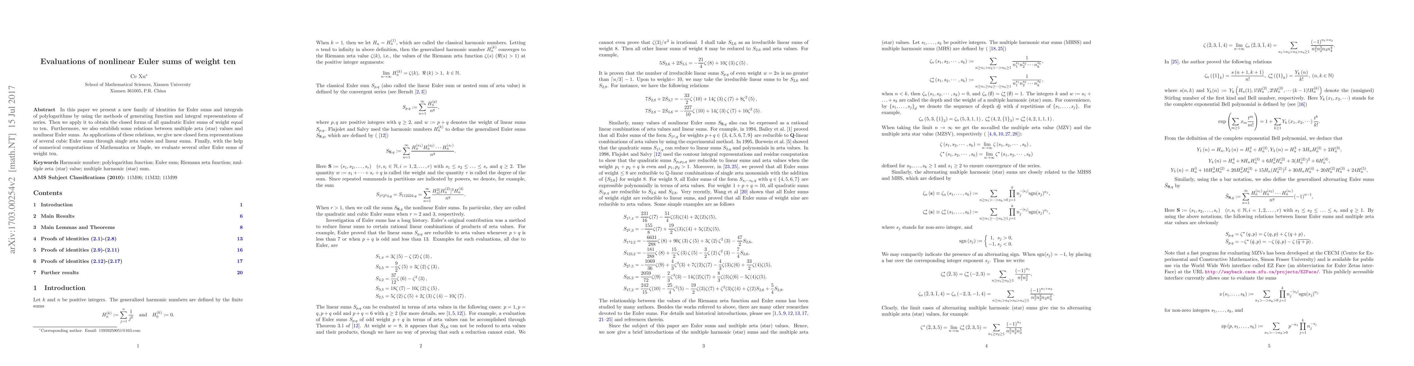 In this paper we present a new family of identities for Euler sums and integrals of polylogarithms by using the methods of generating function and integral representations of series. Then we apply it to obtain the closed forms of all quadratic Euler sums of weight equal to ten. Furthermore, we also establish some relations between multiple zeta (star) values and nonlinear Euler sums. As applications of these relations, we give new closed form representations of several cubic Euler sums through single zeta values and linear sums. Finally, with the help of numerical computations of Mathematica or Maple, we evaluate several other Euler sums of weight ten.