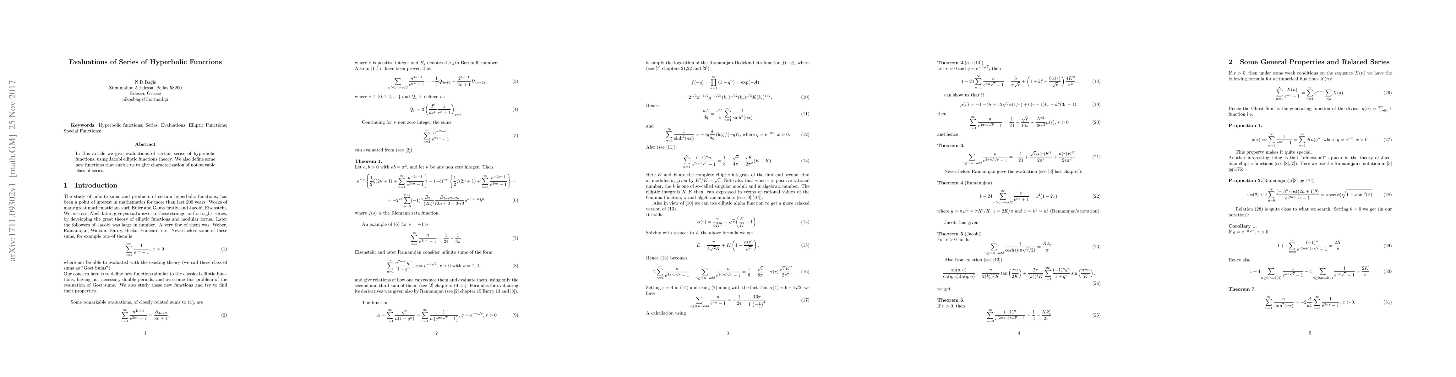 This paper evaluates series of hyperbolic functions using Jacobi elliptic functions theory, introducing new functions to characterize a previously unsolvable class of series.
