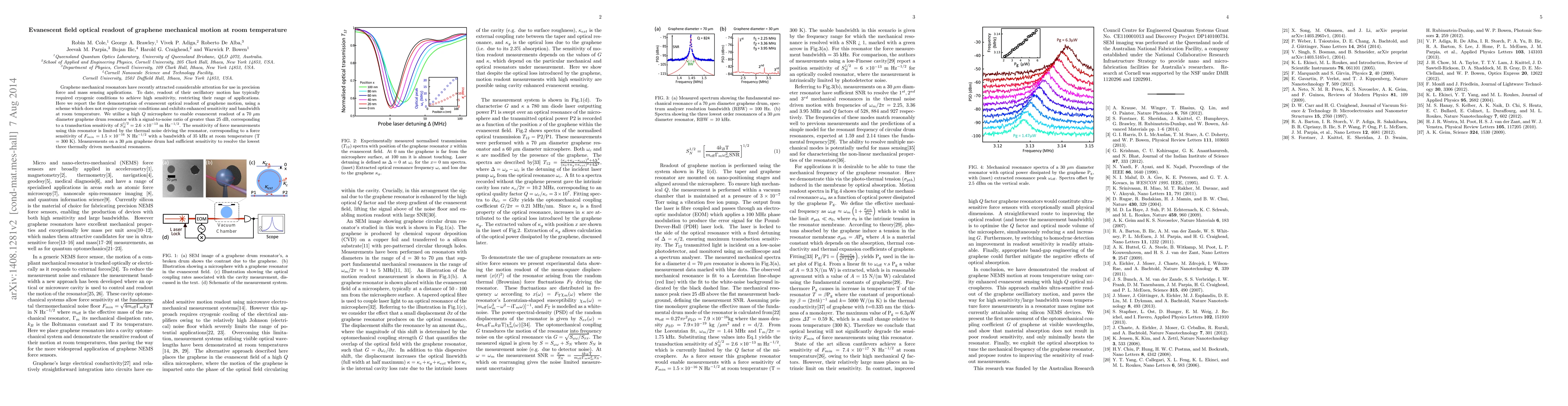 Graphene mechanical resonators have recently attracted considerable attention for use in precision force and mass sensing applications. To date, readout of their oscillatory motion has typically required cryogenic conditions to achieve high sensitivity, restricting their range of applications. Here we report the first demonstration of evanescent optical readout of graphene motion, using a scheme which does not require cryogenic conditions and exhibits enhanced sensitivity and bandwidth at room temperature. We utilise a high $Q$ microsphere to enable evanescent readout of a 70 $\mu$m diameter graphene drum resonator with a signal-to-noise ratio of greater than 25 dB, corresponding to a transduction sensitivity of $S_{N}^{1/2} = $ 2.6 $\times 10^{-13}$ m $\mathrm{Hz}^{-1/2}$. The sensitivity of force measurements using this resonator is limited by the thermal noise driving the resonator, corresponding to a force sensitivity of $F_{min} = 1.5 \times 10^{-16}$ N ${\mathrm{Hz}}^{-1/2}$ with a bandwidth of 35 kHz at room temperature (T = 300 K). Measurements on a 30 $\mu$m graphene drum had sufficient sensitivity to resolve the lowest three thermally driven mechanical resonances.