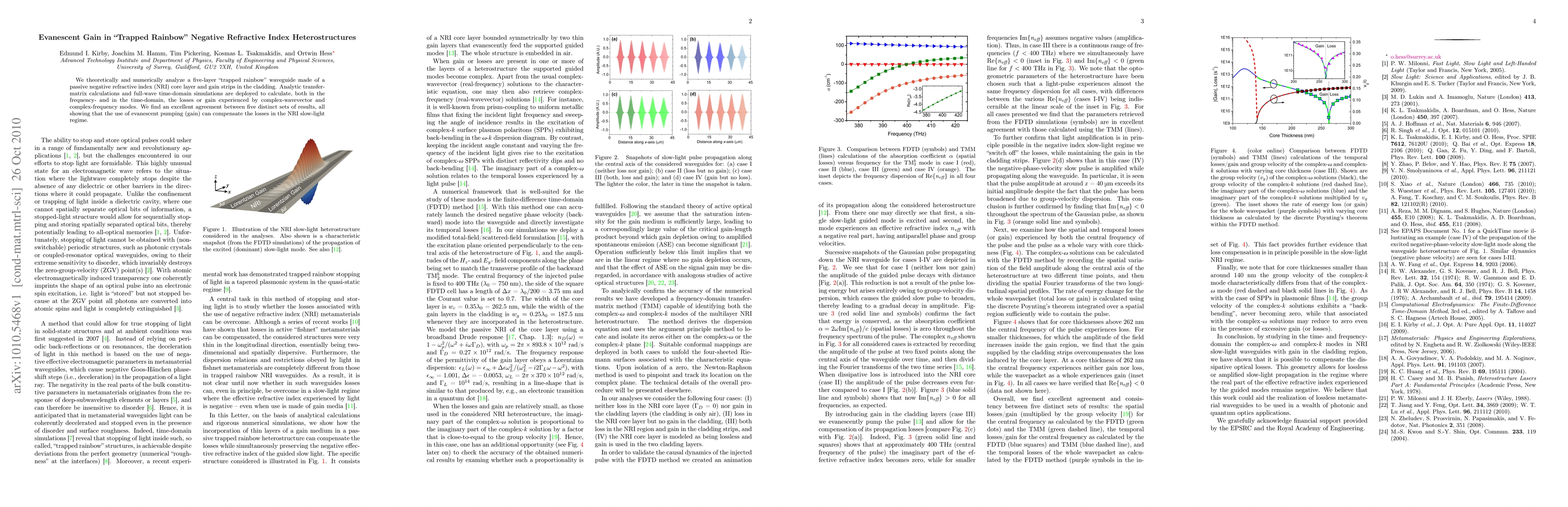 We theoretically and numerically analyze a five-layer "trapped rainbow" waveguide made of a passive negative refractive index (NRI) core layer and gain strips in the cladding. Analytic transfer-matrix calculations and full-wave time-domain simulations are deployed to calculate, both in the frequency- and in the time-domain, the losses or gain experienced by complex-wavevector and complex-frequency modes. We find an excellent agreement between five distinct sets of results, all showing that the use of evanescent pumping (gain) can compensate the losses in the NRI slow-light regime.