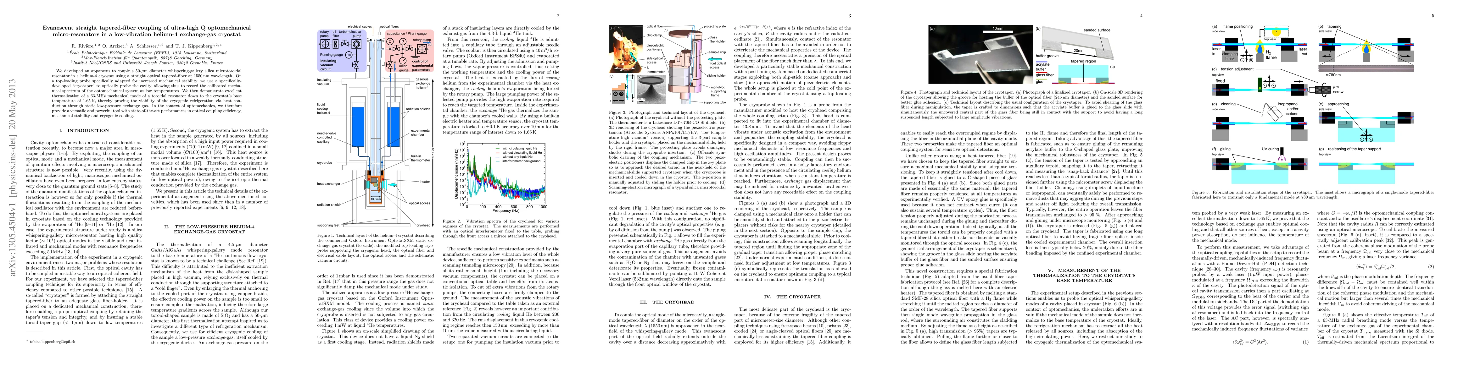 We developed an apparatus to couple a 50-micrometer diameter whispering-gallery silica microtoroidal resonator in a helium-4 cryostat using a straight optical tapered-fiber at 1550nm wavelength. On a top-loading probe specifically adapted for increased mechanical stability, we use a specifically-developed "cryotaper" to optically probe the cavity, allowing thus to record the calibrated mechanical spectrum of the optomechanical system at low temperatures. We then demonstrate excellent thermalization of a 63-MHz mechanical mode of a toroidal resonator down to the cryostat's base temperature of 1.65K, thereby proving the viability of the cryogenic refrigeration via heat conduction through static low-pressure exchange gas. In the context of optomechanics, we therefore provide a versatile and powerful tool with state-of-the-art performances in optical coupling efficiency, mechanical stability and cryogenic cooling.