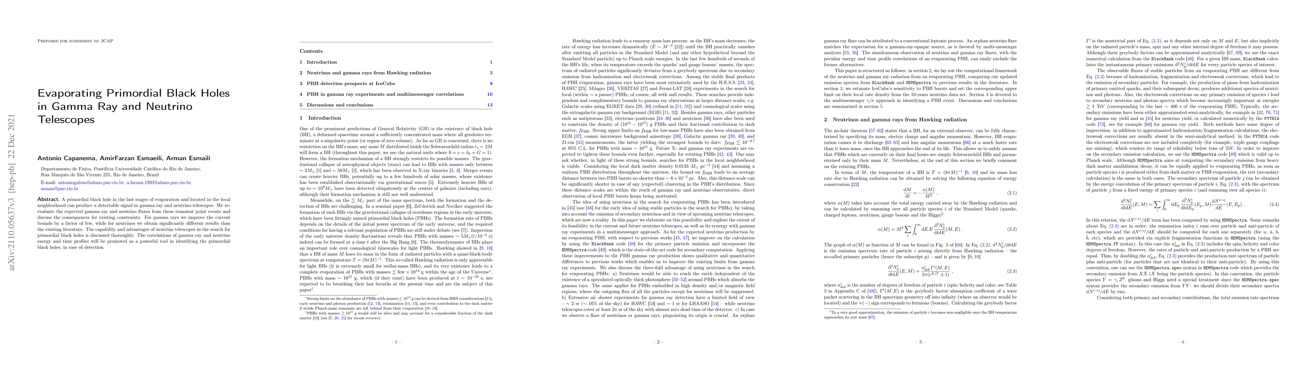 This paper re-evaluates the gamma ray and neutrino signals from evaporating primordial black holes, improving current gamma ray constraints and presenting new neutrino flux results. It highlights the superior capabilities of neutrino telescopes in detecting such transient events and suggests that correlations in gamma ray and neutrino profiles can help identify primordial black holes.