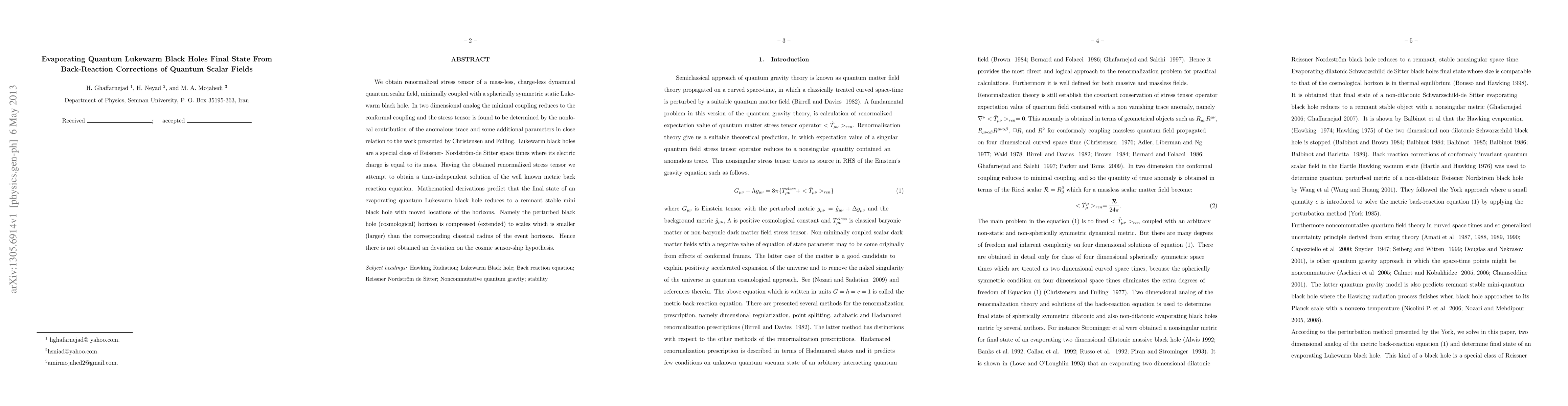 This paper investigates the final state of evaporating quantum Lukewarm black holes through the back-reaction of quantum scalar fields. The authors derive a renormalized stress tensor for a quantum scalar field around these black holes, predicting a remnant stable mini black hole with altered horizon locations, thus supporting the cosmic sensor-ship hypothesis.