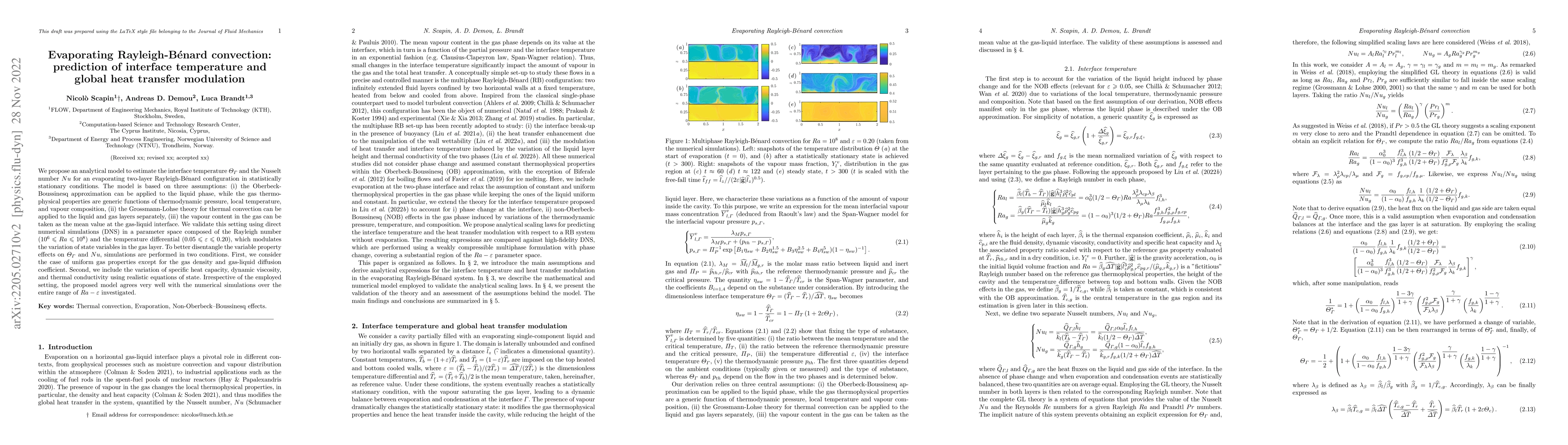 This paper proposes an analytical model to estimate interface temperature and global heat transfer in evaporating Rayleigh-Bénard convection, validated by direct numerical simulations. The model considers variable gas properties and agrees well with simulations across a range of Rayleigh and temperature differential values.