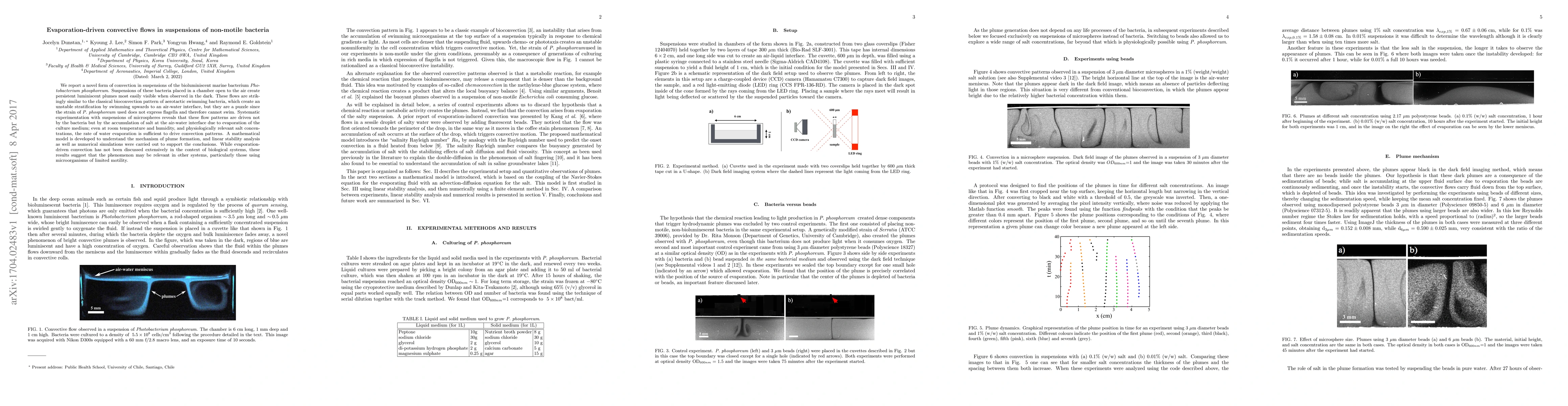 We report a novel form of convection in suspensions of the bioluminiscent marine bacterium $Photobacterium~phosphoreum$. Suspensions of these bacteria placed in a chamber open to the air create persistent luminiscent plumes most easily visible when observed in the dark. These flows are strikingly similar to the classical bioconvection pattern of aerotactic swimming bacteria, which create an unstable stratification by swimming upwards to an air-water interface, but they are a puzzle since the strain of $P.~phosphoreum$ used does not express flagella and therefore cannot swim. Systematic experimentation with suspensions of microspheres reveals that these flow patterns are driven not by the bacteria but by the accumulation of salt at the air-water interface due to evaporation of the culture medium; even at room temperature and humidity, and physiologically relevant salt concentrations, the rate of water evaporation is sufficient to drive convection patterns. A mathematical model is developed to understand the mechanism of plume formation, and linear stability analysis as well as numerical simulations were carried out to support the conclusions. While evaporation-driven convection has not been discussed extensively in the context of biological systems, these results suggest that the phenomenon may be relevant in other systems, particularly those using microorganisms of limited motility.