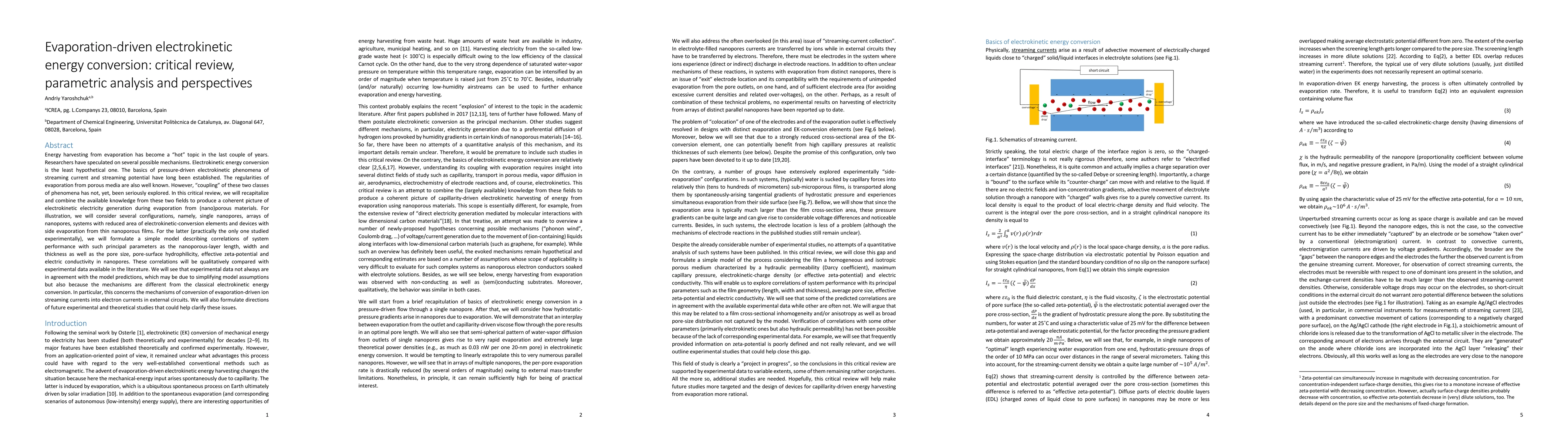 This paper critically reviews the mechanisms of electrokinetic energy conversion during evaporation from porous materials, combining established electrokinetic and evaporation principles. It formulates a model to correlate system performance with key parameters and compares it to experimental data, highlighting discrepancies and suggesting future research directions to better understand the unique conversion mechanisms.