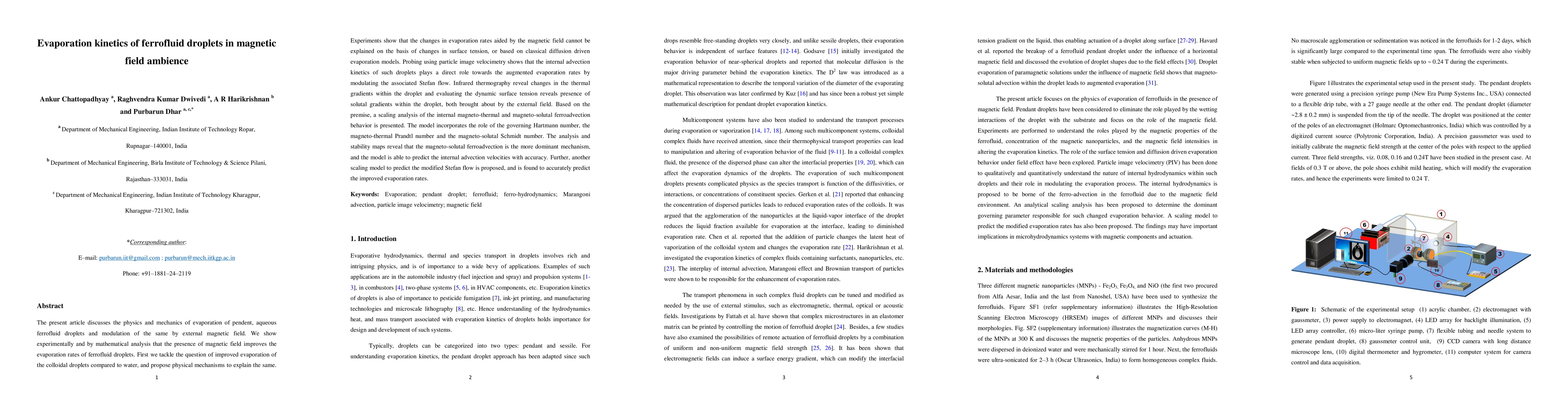 This paper investigates the enhanced evaporation rates of ferrofluid droplets under an external magnetic field, showing that magnetic fields improve evaporation through internal advection kinetics and modified Stefan flow. The study combines experimental and mathematical analysis to propose a model incorporating magnetothermal and magnetosolutal effects, predicting the internal advection velocities and improved evaporation rates accurately.