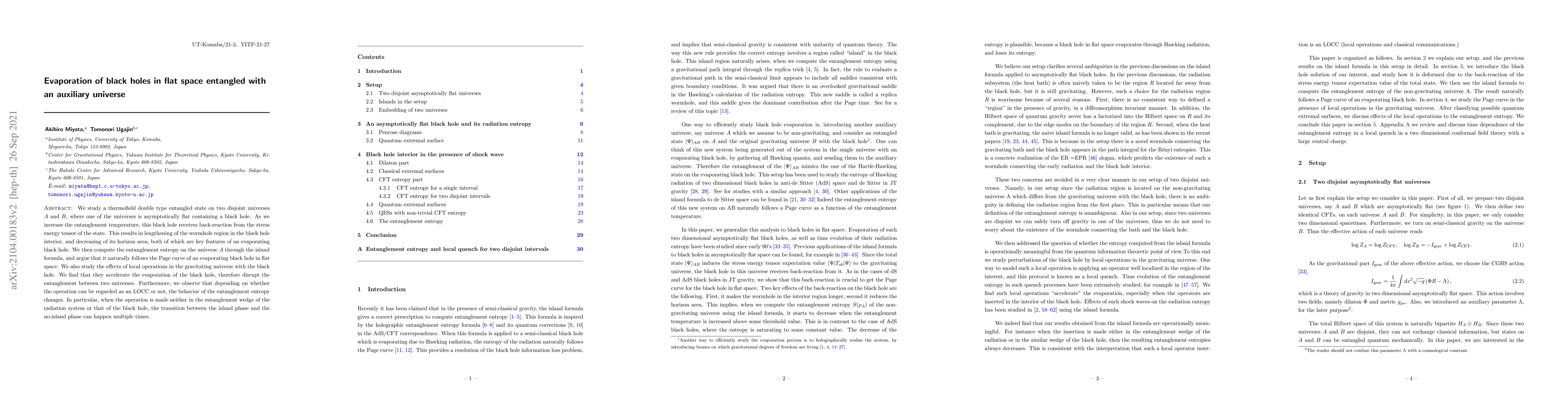 We study a thermofield double type entangled state on two disjoint universes $A$ and $B$, where one of the universes is asymptotically flat containing a black hole. As we increase the entanglement temperature, this black hole receives back-reaction from the stress energy tensor of the state. This results in lengthening of the wormhole region in the black hole interior, and decreasing of its horizon area, both of which are key features of an evaporating black hole. We then compute the entanglement entropy on the universe $A$ through the island formula, and argue that it naturally follows the Page curve of an evaporating black hole in flat space. We also study the effects of local operations in the gravitating universe with the black hole. We find that they accelerate the evaporation of the black hole, therefore disrupt the entanglement between two universes. Furthermore, we observe that depending on whether the operation can be regarded as an LOCC or not, the behavior of the entanglement entropy changes. In particular, when the operation is made neither in the entanglement wedge of the radiation system or that of the black hole, the transition between the island phase and the no-island phase can happen multiple times.