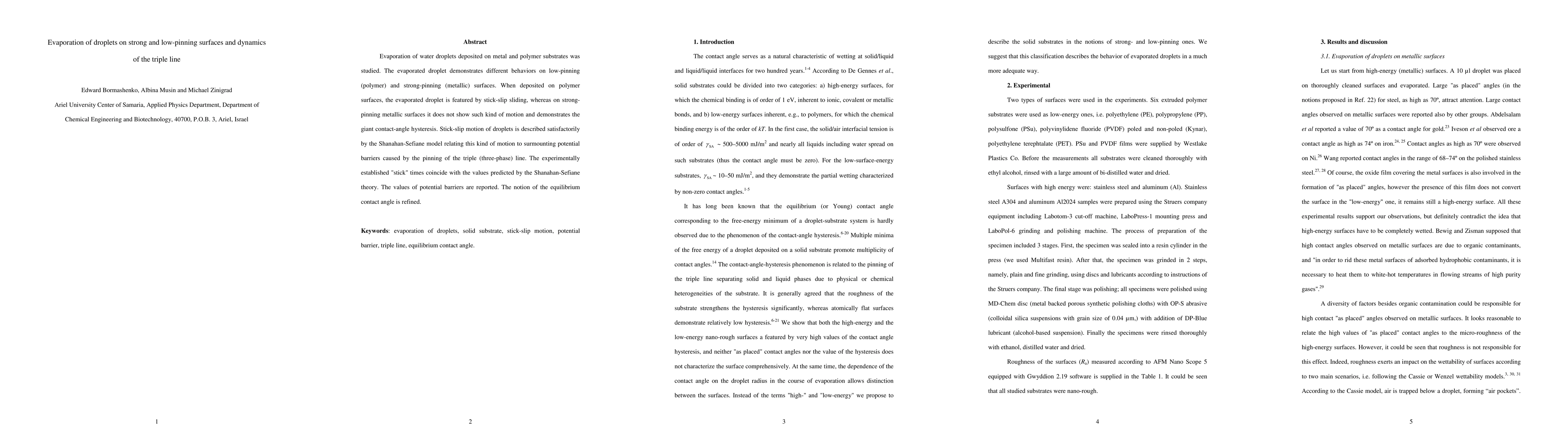 This study investigates the evaporation and dynamics of water droplets on different substrates, showing distinct behaviors on low-pinning polymer and strong-pinning metallic surfaces. Droplets on polymers exhibit stick-slip sliding, while metallic surfaces cause giant contact-angle hysteresis, with the Shanahan-Sefiane model explaining the stick-slip motion.