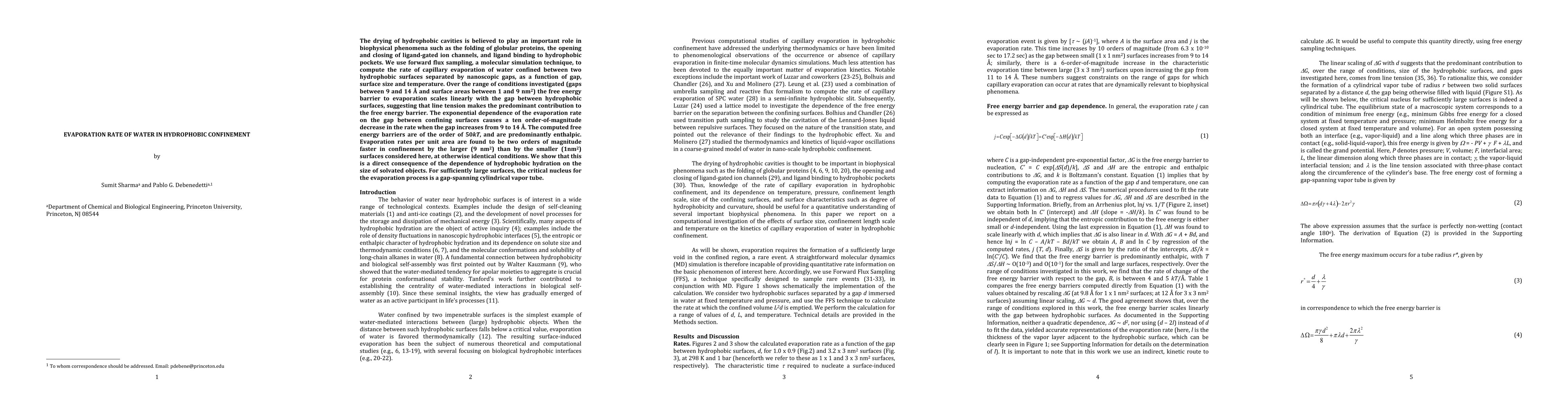 This study uses molecular simulation to determine the evaporation rate of water in hydrophobic confinement, finding a significant decrease in evaporation rate with increasing gap size. The free energy barrier scales linearly with gap size, primarily due to line tension, and evaporation rates are much faster for larger surface areas.