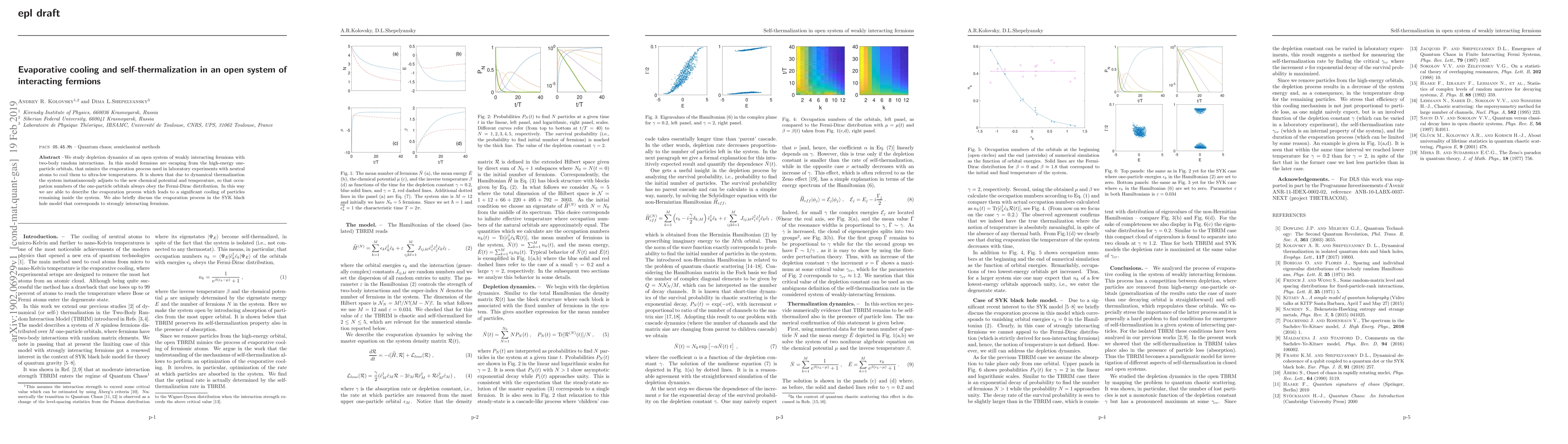We study depletion dynamics of an open system of weakly interacting fermions with two-body random interactions. In this model fermions are escaping from the high-energy one-particle orbitals, that mimics the evaporation process used in laboratory experiments with neutral atoms to cool them to ultra-low temperatures. It is shown that due to dynamical thermalization the system instantaneously adjusts to the new chemical potential and temperature, so that occupation numbers of the one-particle orbitals always obey the Fermi-Dirac distribution. In this way we are able to describe the evaporation process which leads to a significant cooling of particles remaining inside the system. We also briefly discuss the evaporation process in the SYK black hole model that corresponds to strongly interacting fermions.