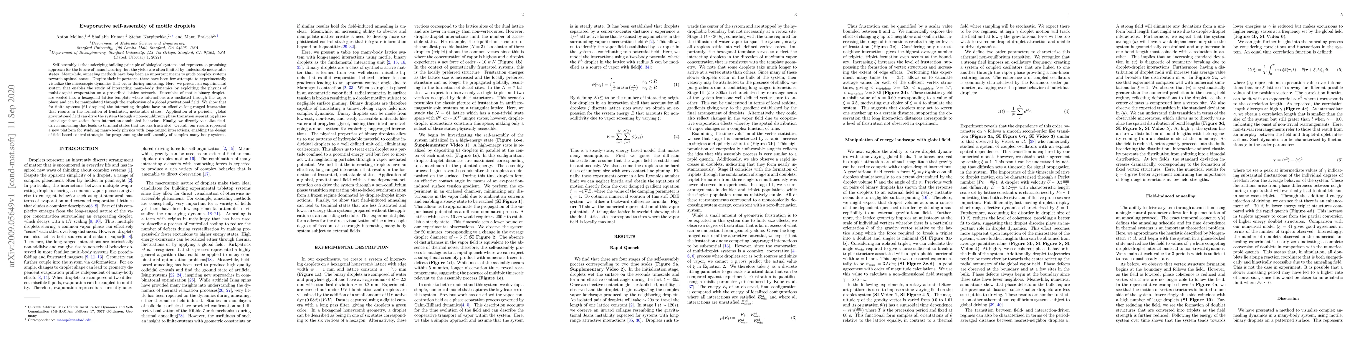 Self-assembly is the underlying building principle of biological systems and represents a promising approach for the future of manufacturing, but the yields are often limited by undesirable metastable states. Meanwhile, annealing methods have long been an important means to guide complex systems towards optimal states. Despite their importance, there have been few attempts to experimentally visualize the microscopic dynamics that occur during annealing. Here, we present an experimental system that enables the study of interacting many-body dynamics by exploiting the physics of multi-droplet evaporation on a prescribed lattice network. Ensembles of motile binary droplets are seeded into a hexagonal lattice template where interactions are mediated through the vapor phase and can be manipulated through the application of a global gravitational field. We show that for finite systems (61 droplets) the interacting droplets have an effective long-ranged interaction that results in the formation of frustrated, metastable states. Application of a periodic, global gravitational field can drive the system through a non-equilibrium phase transition separating phase-locked synchronization from interaction-dominated behavior. Finally, we directly visualize field-driven annealing that leads to terminal states that are less frustrated. Overall, our results represent a new platform for studying many-body physics with long-ranged interactions, enabling the design of field-based control strategies for programming the self-assembly of complex many-body systems.