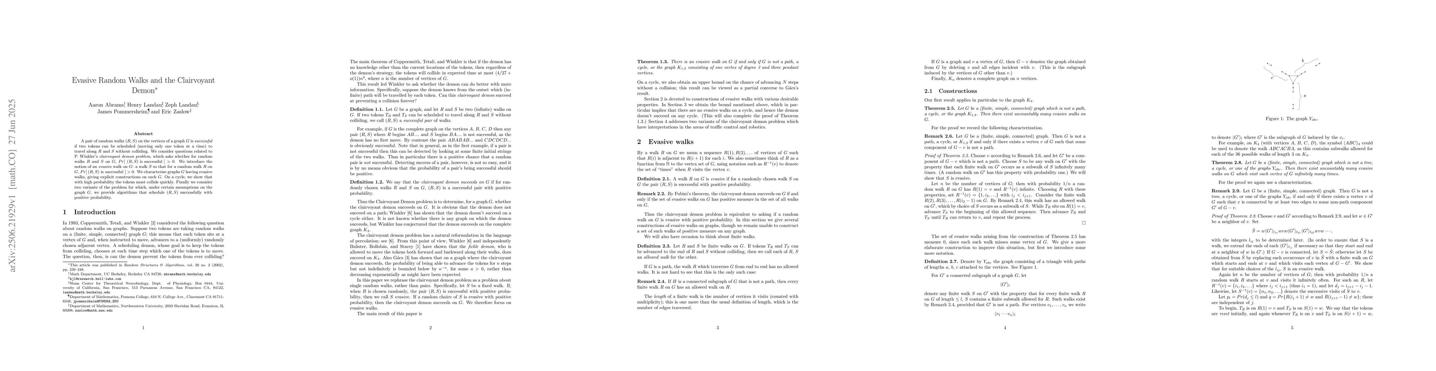 A pair of random walks $(R,S)$ on the vertices of a graph $G$ is {\it successful} if two tokens can be scheduled (moving only one token at a time) to travel along $R$ and $S$ without colliding. We consider questions related to P. Winkler's {\it clairvoyant demon problem}, which asks whether for random walks $R$ and $S$ on $G$, $Pr[\ (R,S) \mbox{ is successful }] >0$. We introduce the notion of an {\it evasive} walk on $G$: a walk $S$ so that for a random walk $R$ on $G$, $Pr[\ (R,S) \mbox{ is successful }]>0$. We characterize graphs $G$ having evasive walks, giving explicit constructions on such $G$. On a cycle, we show that with high probability the tokens must collide quickly. Finally we consider two variants of the problem for which, under certain assumptions on the graph $G$, we provide algorithms that schedule $(R,S)$ successfully with positive probability.