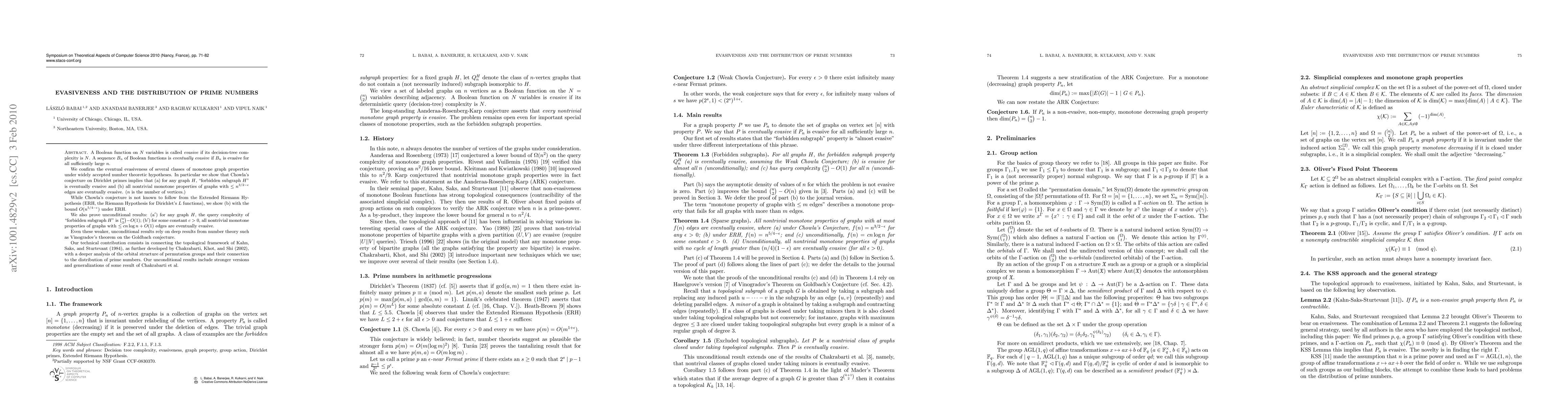 We confirm the eventual evasiveness of several classes of monotone graph properties under widely accepted number theoretic hypotheses. In particular we show that Chowla's conjecture on Dirichlet primes implies that (a) for any graph $H$, "forbidden subgraph $H$" is eventually evasive and (b) all nontrivial monotone properties of graphs with $\le n^{3/2-\epsilon}$ edges are eventually evasive. ($n$ is the number of vertices.) While Chowla's conjecture is not known to follow from the Extended Riemann Hypothesis (ERH, the Riemann Hypothesis for Dirichlet's $L$ functions), we show (b) with the bound $O(n^{5/4-\epsilon})$ under ERH. We also prove unconditional results: (a$'$) for any graph $H$, the query complexity of "forbidden subgraph $H$" is $\binom{n}{2} - O(1)$; (b$'$) for some constant $c>0$, all nontrivial monotone properties of graphs with $\le cn\log n+O(1)$ edges are eventually evasive. Even these weaker, unconditional results rely on deep results from number theory such as Vinogradov's theorem on the Goldbach conjecture. Our technical contribution consists in connecting the topological framework of Kahn, Saks, and Sturtevant (1984), as further developed by Chakrabarti, Khot, and Shi (2002), with a deeper analysis of the orbital structure of permutation groups and their connection to the distribution of prime numbers. Our unconditional results include stronger versions and generalizations of some result of Chakrabarti et al.