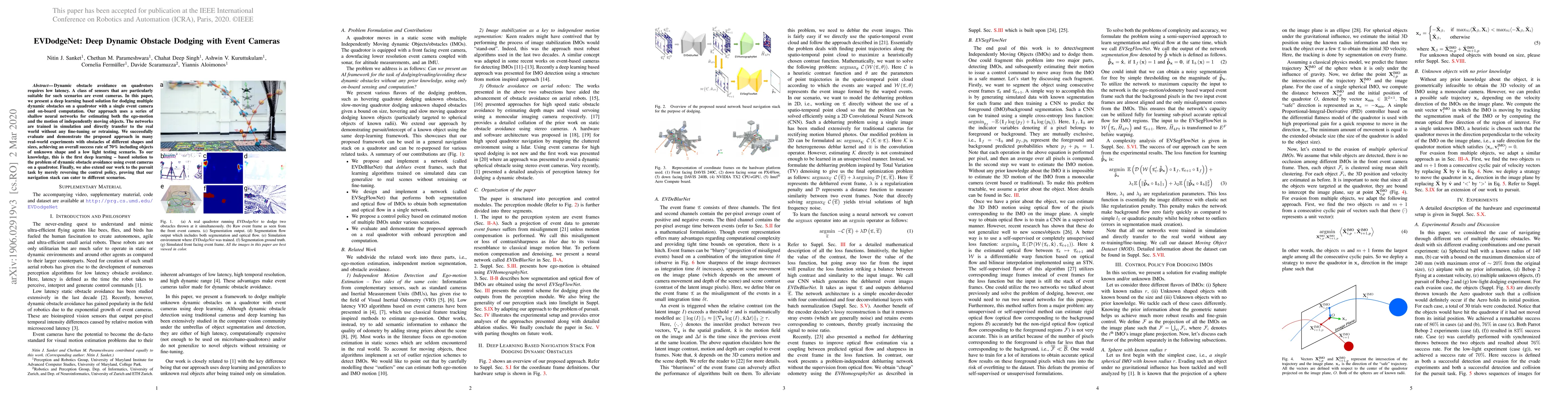 Dynamic obstacle avoidance on quadrotors requires low latency. A class of sensors that are particularly suitable for such scenarios are event cameras. In this paper, we present a deep learning -- based solution for dodging multiple dynamic obstacles on a quadrotor with a single event camera and on-board computation. Our approach uses a series of shallow neural networks for estimating both the ego-motion and the motion of independently moving objects. The networks are trained in simulation and directly transfer to the real world without any fine-tuning or retraining. We successfully evaluate and demonstrate the proposed approach in many real-world experiments with obstacles of different shapes and sizes, achieving an overall success rate of 70% including objects of unknown shape and a low light testing scenario. To our knowledge, this is the first deep learning -- based solution to the problem of dynamic obstacle avoidance using event cameras on a quadrotor. Finally, we also extend our work to the pursuit task by merely reversing the control policy, proving that our navigation stack can cater to different scenarios.