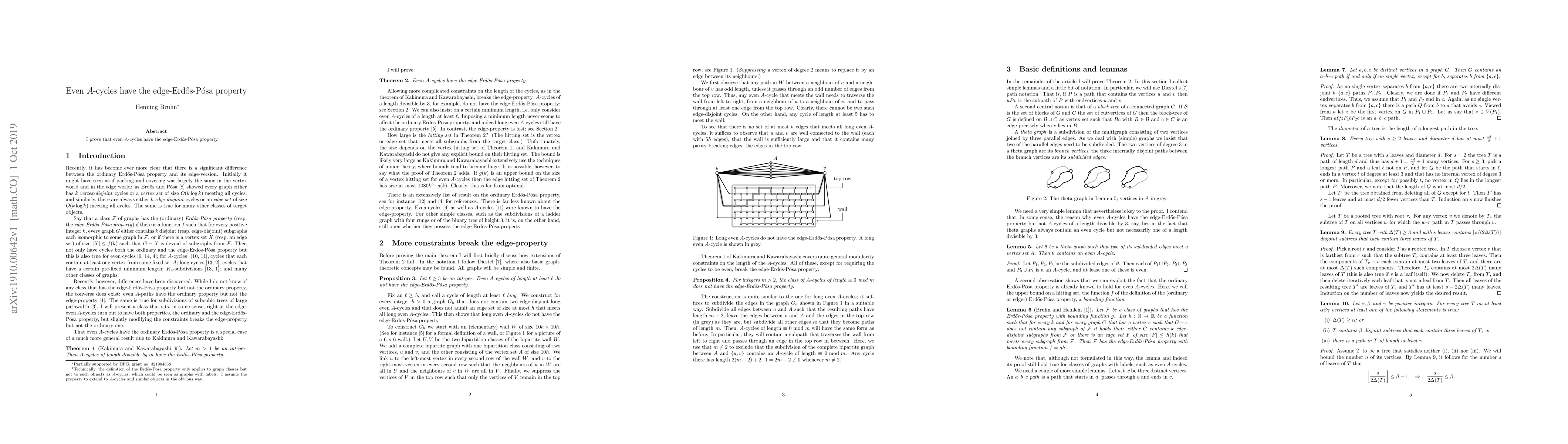 Summary: The paper demonstrates that even $A$-cycles possess the edge-Erdős-Pósa property, which implies that any subgraph containing a specific even $A$-cycle can be decomposed into disjoint edge-disjoint copies of that cycle.