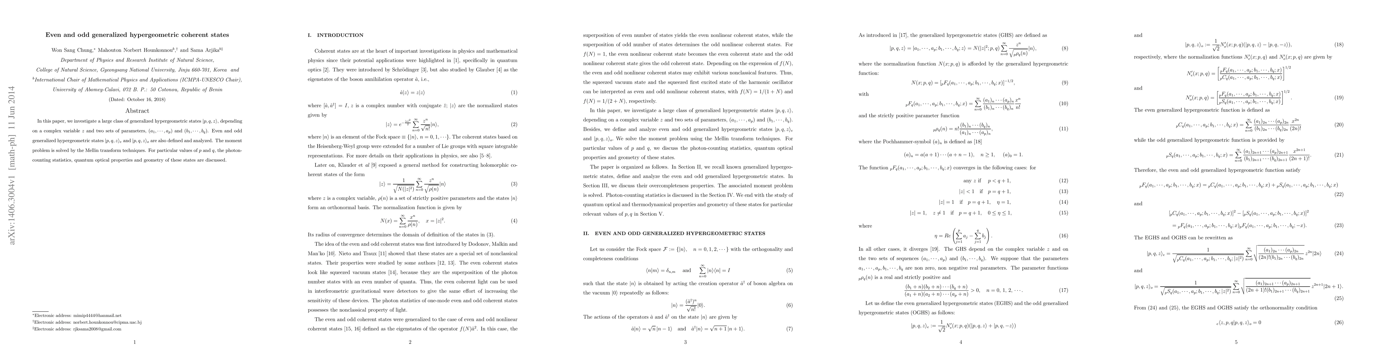 This paper explores generalized hypergeometric coherent states $|p,q,z\rangle$ and their even and odd variants $|p,q,z\rangle_e$ and $|p,q,z\rangle_o$, solving the moment problem via Mellin transform techniques. It also examines photon-counting statistics and quantum optical properties for specific values of $p$ and $q$.