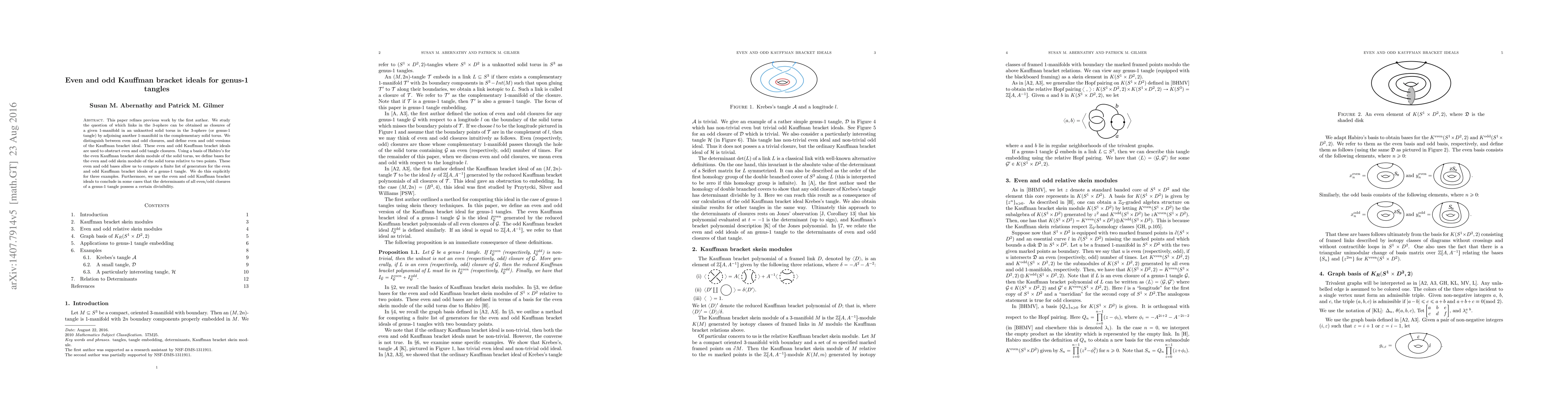 This paper refines previous work by studying genus-1 tangles and their closures in the 3-sphere, defining even and odd Kauffman bracket ideals to classify closures. It provides explicit bases for computing these ideals and shows that the determinants of even/odd closures exhibit specific divisibility properties.