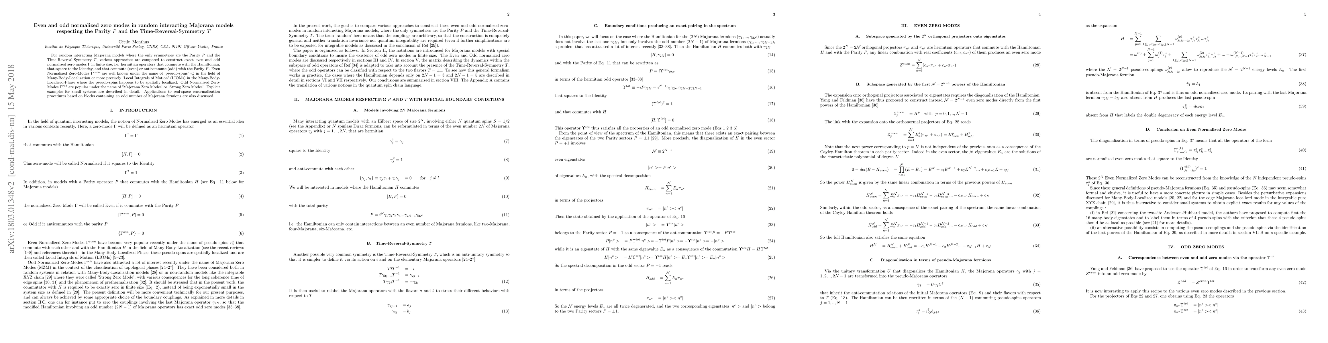 This paper examines random interacting Majorana models with only Parity $P$ and Time-Reversal-Symmetry $T$ symmetries, focusing on constructing normalized zero modes $\Gamma$. It distinguishes even normalized zero modes $\Gamma^{even}$ (pseudo-spins) from odd ones $\Gamma^{odd}$ (Majorana zero modes), providing detailed examples and applications to real-space renormalization methods.