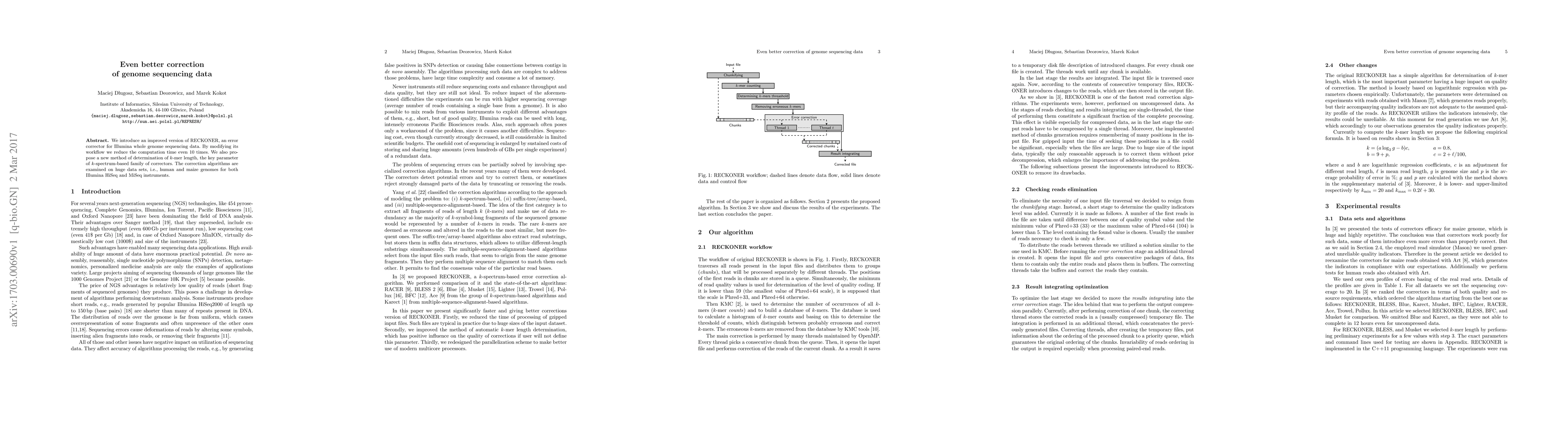 We introduce an improved version of RECKONER, an error corrector for Illumina whole genome sequencing data. By modifying its workflow we reduce the computation time even 10 times. We also propose a new method of determination of $k$-mer length, the key parameter of $k$-spectrum-based family of correctors. The correction algorithms are examined on huge data sets, i.e., human and maize genomes for both Illumina HiSeq and MiSeq instruments.