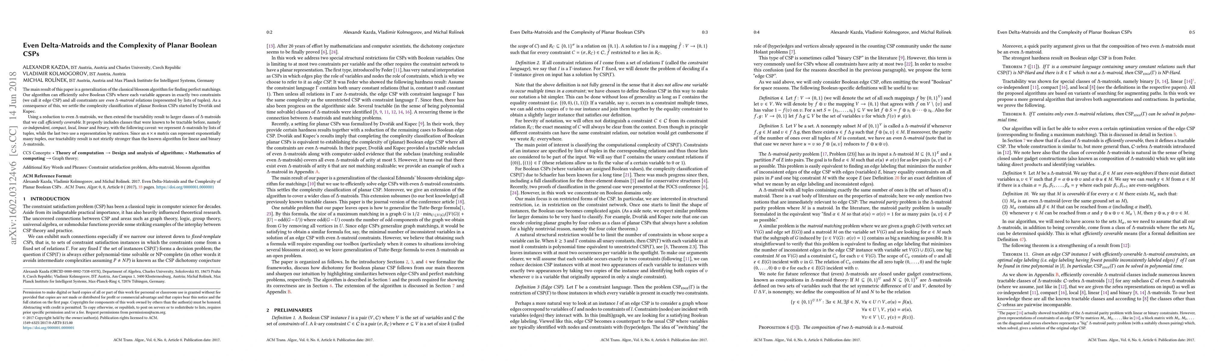 This paper solves the complexity classification of planar Boolean CSPs, showing that certain classes of Delta-matroids can be solved efficiently using a generalization of the blossom algorithm. It extends this result to larger classes of efficiently coverable Delta-matroids.