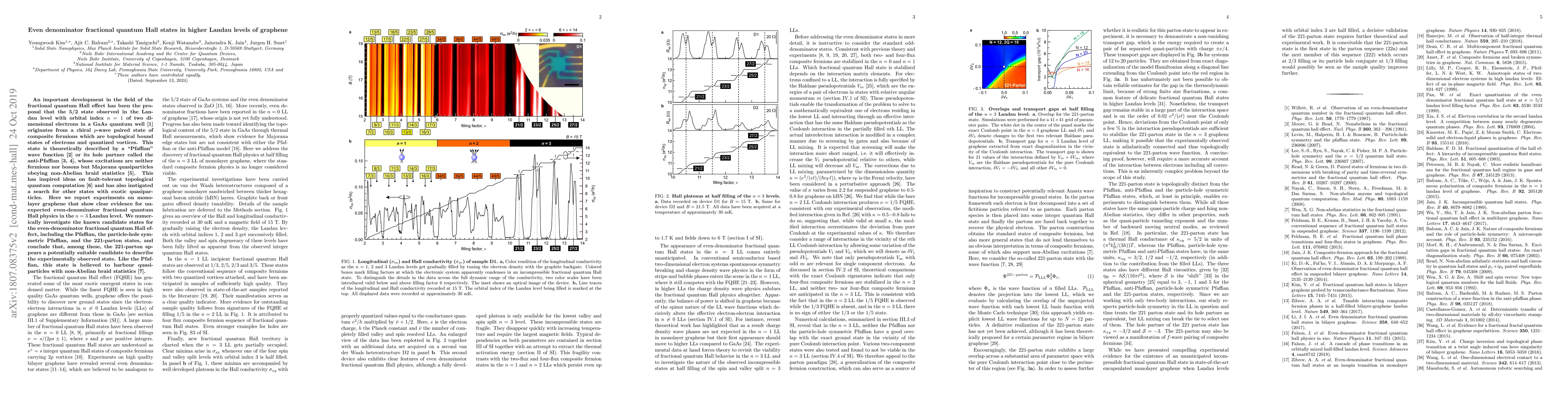 An important development in the field of the fractional quantum Hall effect has been the proposal that the 5/2 state observed in the Landau level with orbital index $n = 1$ of two dimensional electrons in a GaAs quantum well originates from a chiral $p$-wave paired state of composite fermions which are topological bound states of electrons and quantized vortices. This state is theoretically described by a "Pfaffian" wave function or its hole partner called the anti-Pfaffian, whose excitations are neither fermions nor bosons but Majorana quasiparticles obeying non-Abelian braid statistics. This has inspired ideas on fault-tolerant topological quantum computation and has also instigated a search for other states with exotic quasiparticles. Here we report experiments on monolayer graphene that show clear evidence for unexpected even-denominator fractional quantum Hall physics in the $n=3$ Landau level. We numerically investigate the known candidate states for the even-denominator fractional quantum Hall effect, including the Pfaffian, the particle-hole symmetric Pfaffian, and the 221-parton states, and conclude that, among these, the 221-parton appears a potentially suitable candidate to describe the experimentally observed state. Like the Pfaffian, this state is believed to harbour quasi-particles with non-Abelian braid statistics