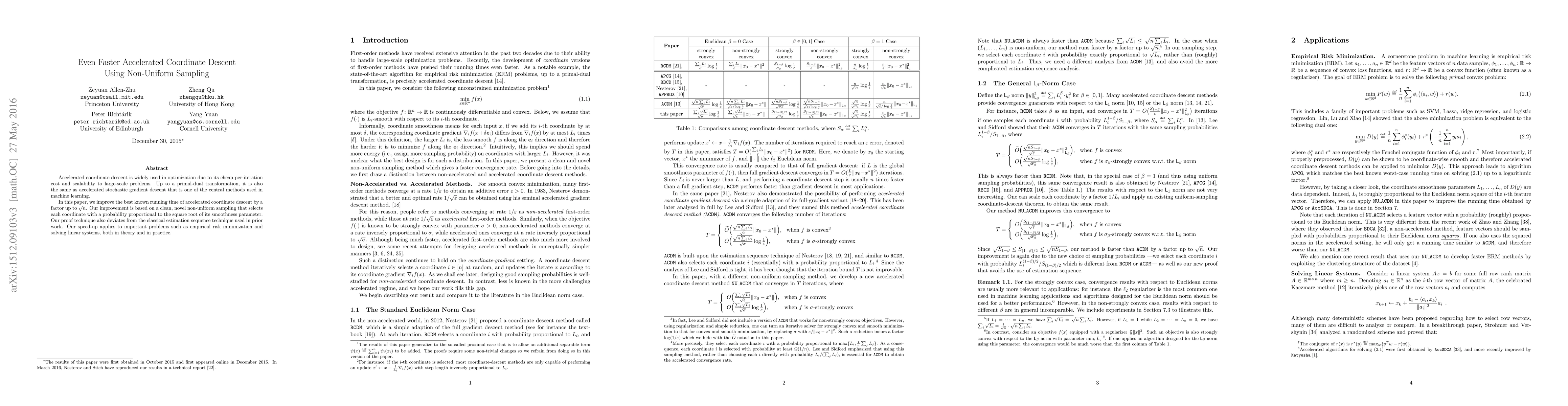 This paper presents an accelerated coordinate descent method using non-uniform sampling, improving the best known running time by up to $\sqrt{n}$ through a novel sampling strategy that prioritizes coordinates based on their smoothness parameter. The method outperforms traditional techniques and applies to large-scale optimization problems like empirical risk minimization and linear system solving.