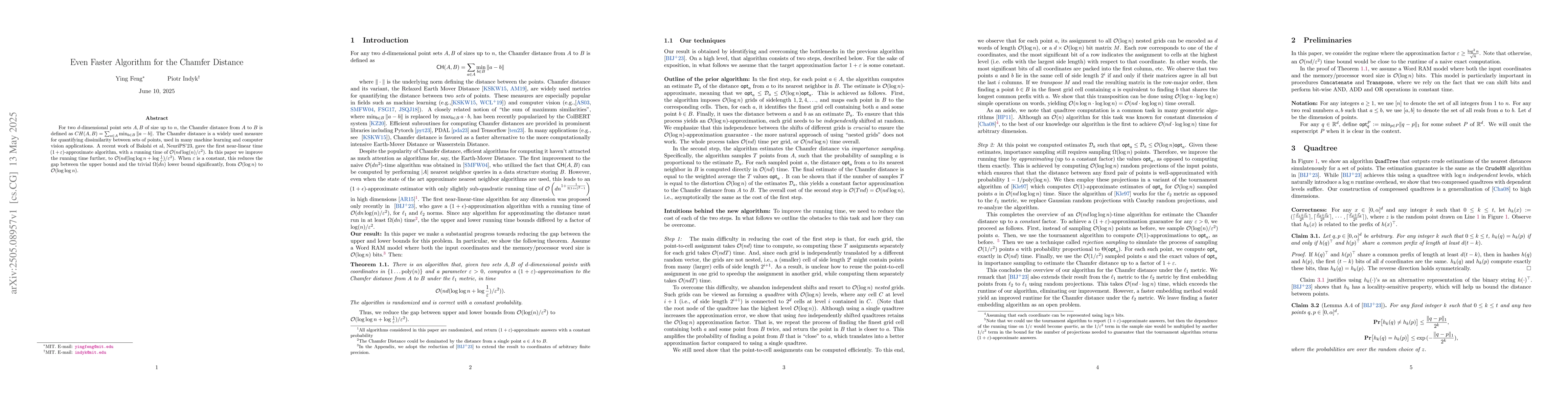 The paper's main technical contribution is an improved near-linear time algorithm for approximating the Chamfer distance, reducing its running time under certain conditions.