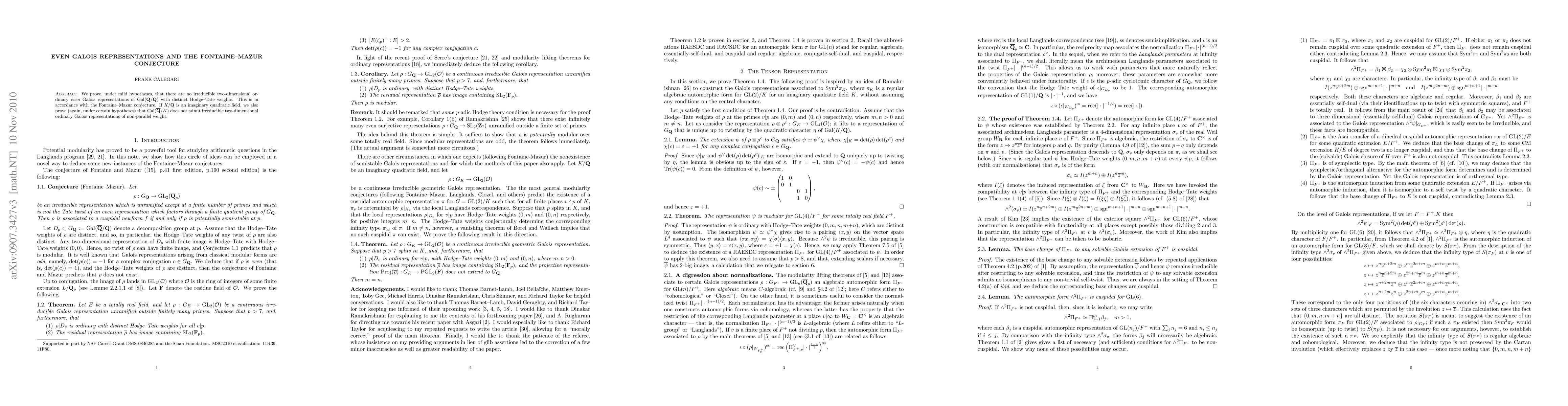 This paper proves specific cases of the Fontaine-Mazur conjecture for even Galois representations, showing that certain irreducible two-dimensional representations of $\Gal(\Qbar/\Q)$ have no distinct Hodge-Tate weights. It also addresses imaginary quadratic fields, proving the absence of non-parallel weight representations for $\Gal(\Qbar/K)$. Additionally, it concludes that any weakly compatible family of such representations is either modular or finite.