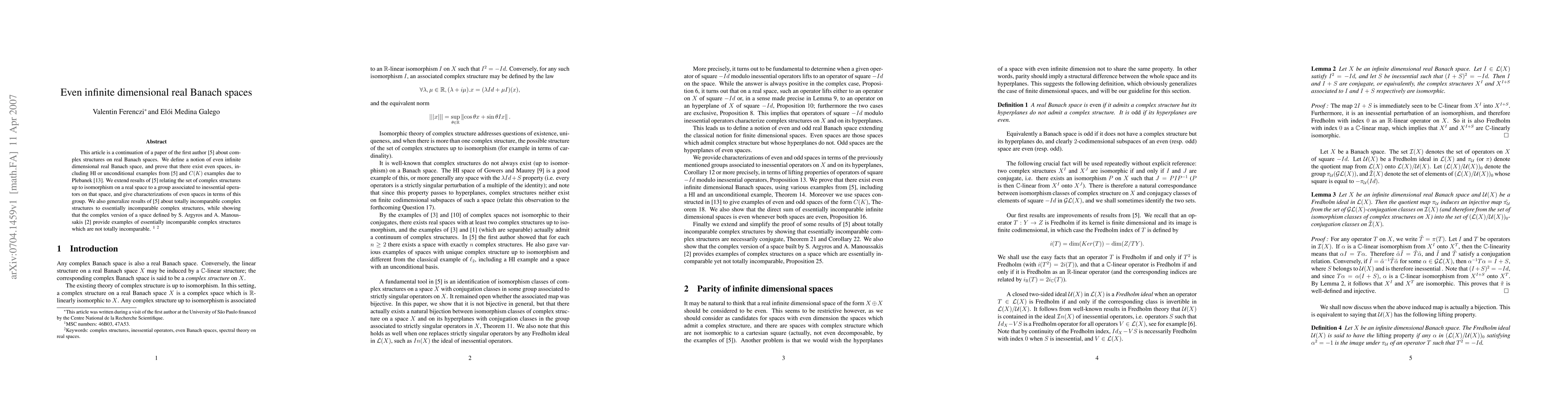 This paper extends the study of complex structures on real Banach spaces by defining even infinite-dimensional real Banach spaces and proving their existence, including examples from HI spaces and $C(K)$. It also characterizes these even spaces in terms of a group associated with inessential operators.