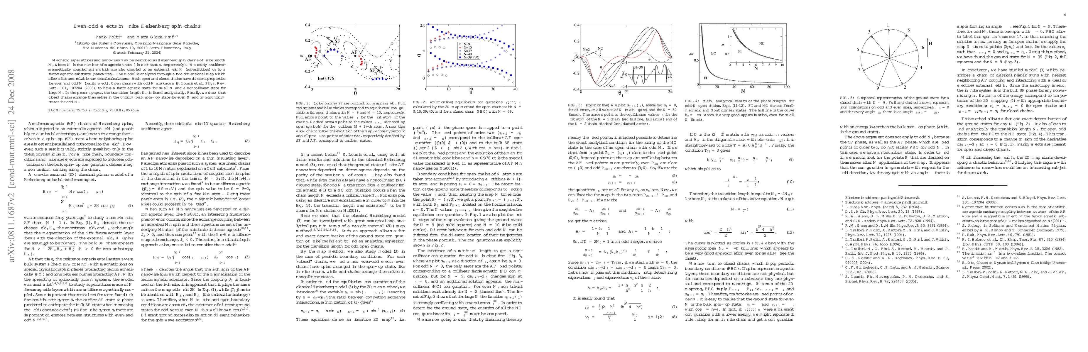 This paper investigates the even-odd effects in finite Heisenberg spin chains, analyzing antiferromagnetically coupled spins in magnetic superlattices and nanowires. The study reveals distinct properties for chains with even versus odd lengths, including a transition length N_c for open chains and different spin arrangements in closed chains.