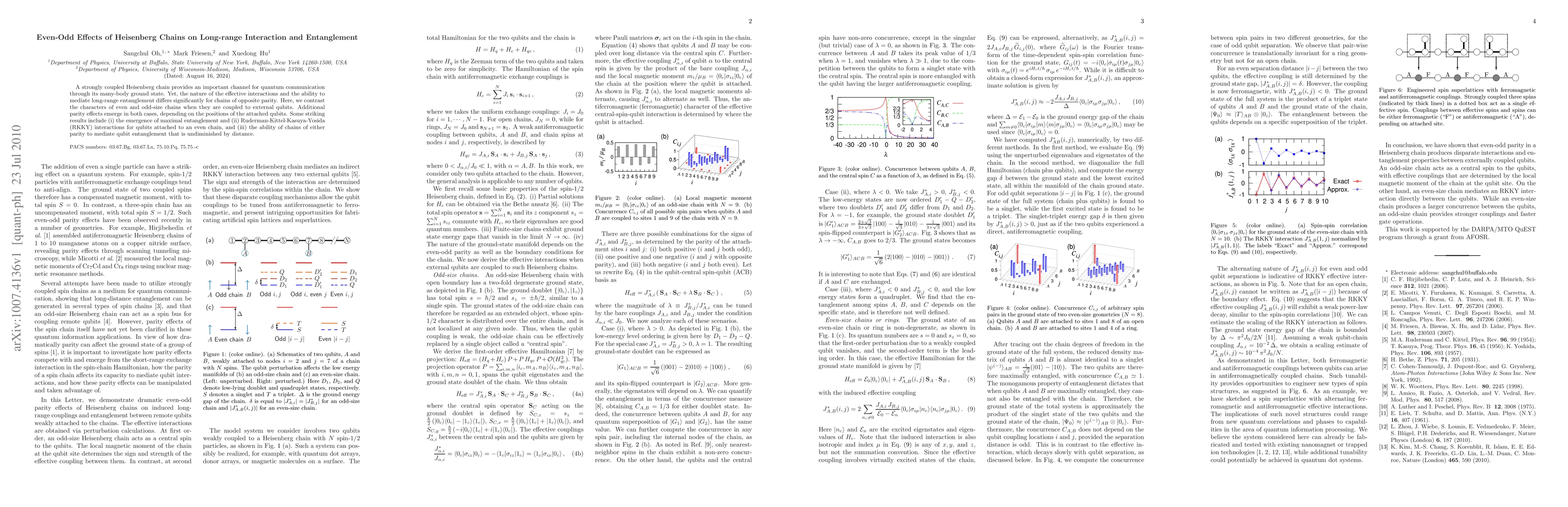 This paper investigates the contrasting behaviors of even and odd-sized Heisenberg chains in mediating long-range interactions and entanglement with external qubits, revealing maximal entanglement and RKKY interactions for even chains, while both parities can mediate undiminished qubit entanglement over distance.