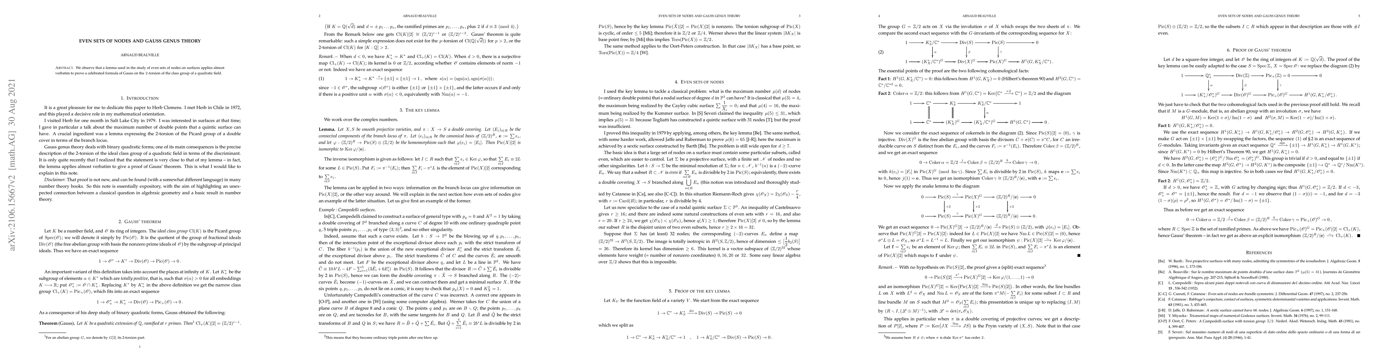 We observe that a lemma used in the study of even sets of nodes on surfaces applies almost verbatim to prove a celebrated formula of Gauss on the 2-torsion of the class group of a quadratic field.