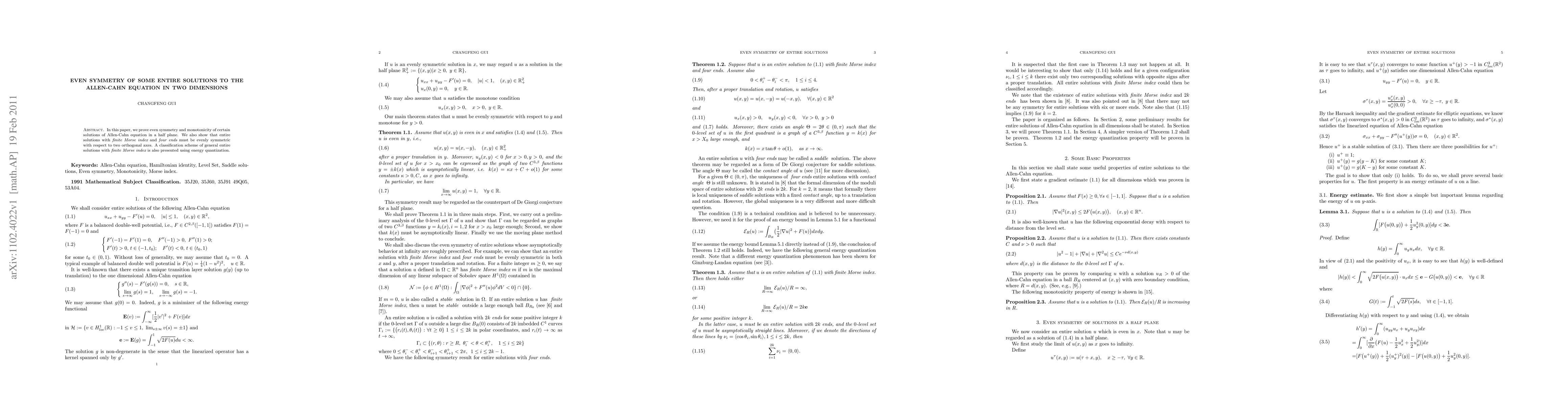 In this paper, we prove even symmetry and monotonicity of certain solutions of Allen-Cahn equation in a half plane. We also show that entire solutions with {\it finite Morse index} and {\it four ends} must be evenly symmetric with respect to two orthogonal axes. A classification scheme of general entire solutions with {\it finite Morse index} is also presented using energy quantization.