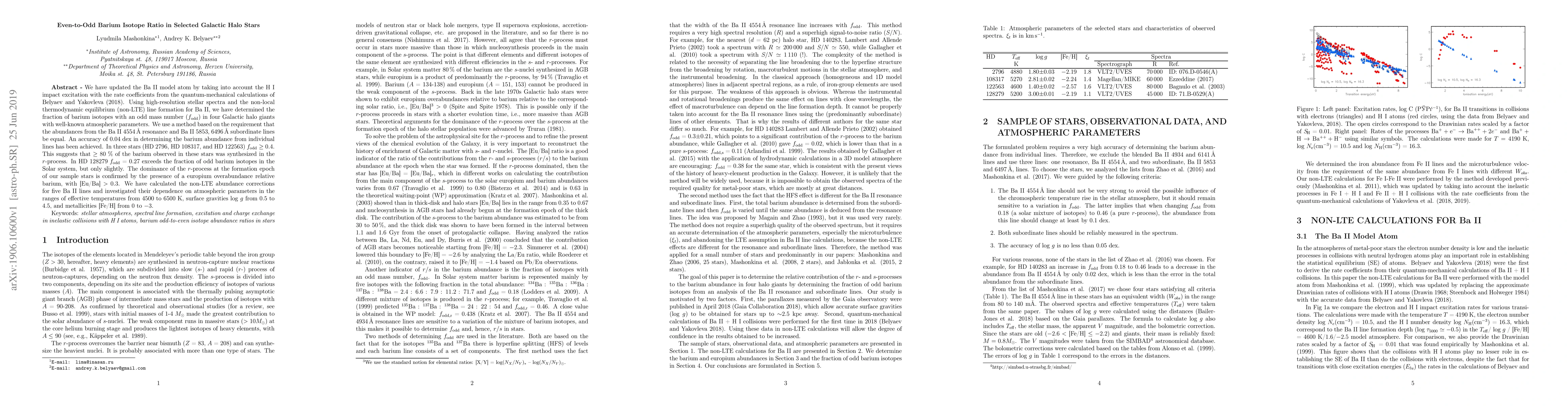 This study updates the Ba II model atom, determines barium isotope ratios in Galactic halo stars using high-resolution spectra and non-LTE line formation. Findings indicate that in three stars, over 80% of barium was synthesized via the r-process, confirmed by europium overabundance. Non-LTE abundance corrections for Ba II lines are also calculated and analyzed across various stellar parameters.