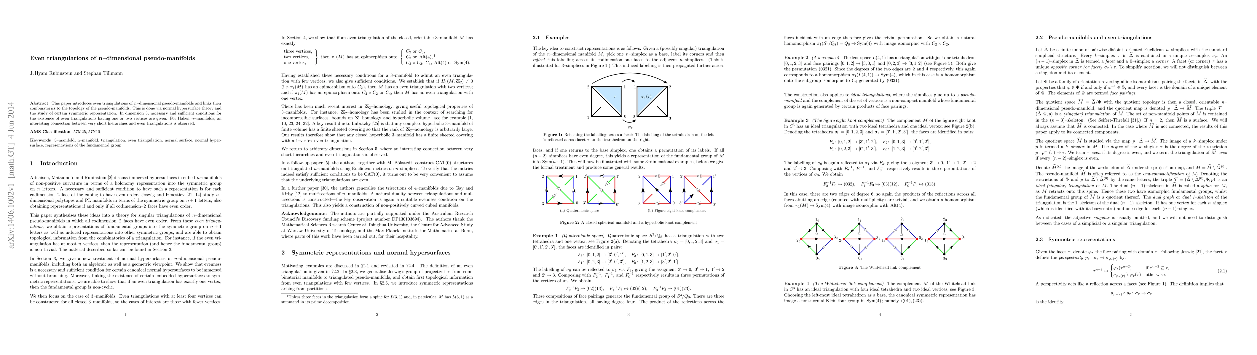 This paper explores even triangulations of n-dimensional pseudo-manifolds, linking their combinatorial properties to the topology through normal hypersurface theory. It provides conditions for the existence of such triangulations in dimension 3 and observes a connection between very short hierarchies and even triangulations in Haken n-manifolds.