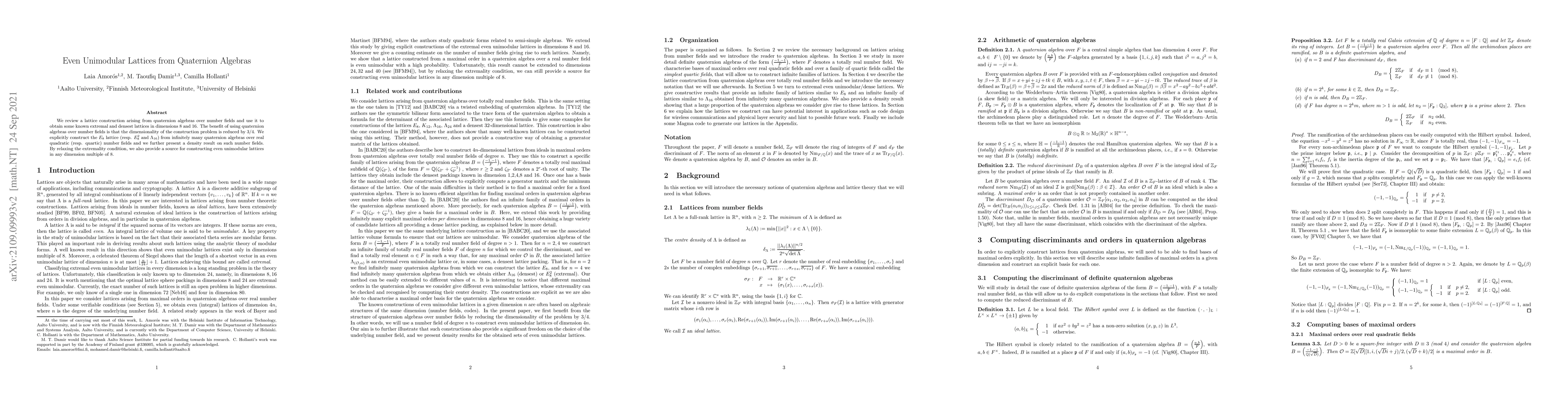 This paper constructs even unimodular lattices from quaternion algebras over number fields, achieving dimensionality reduction and obtaining extremal lattices such as $E_8$, $E_8^2$, and $\Lambda_{16}$. It also provides a density result for these number fields and a method for constructing such lattices in dimensions multiple of 8.