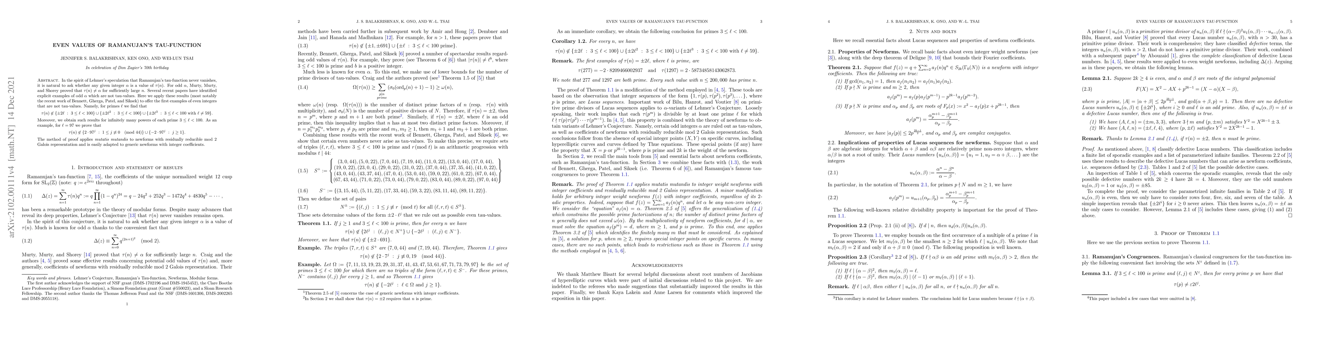 This paper provides the first examples of even integers that are not values of Ramanujan's tau-function, specifically for primes $\ell$ in the range $3\leq \ell < 100$. The authors demonstrate that $\tau(n)$ does not include certain even multiples of primes and their powers, extending the results to infinitely many powers of each prime.