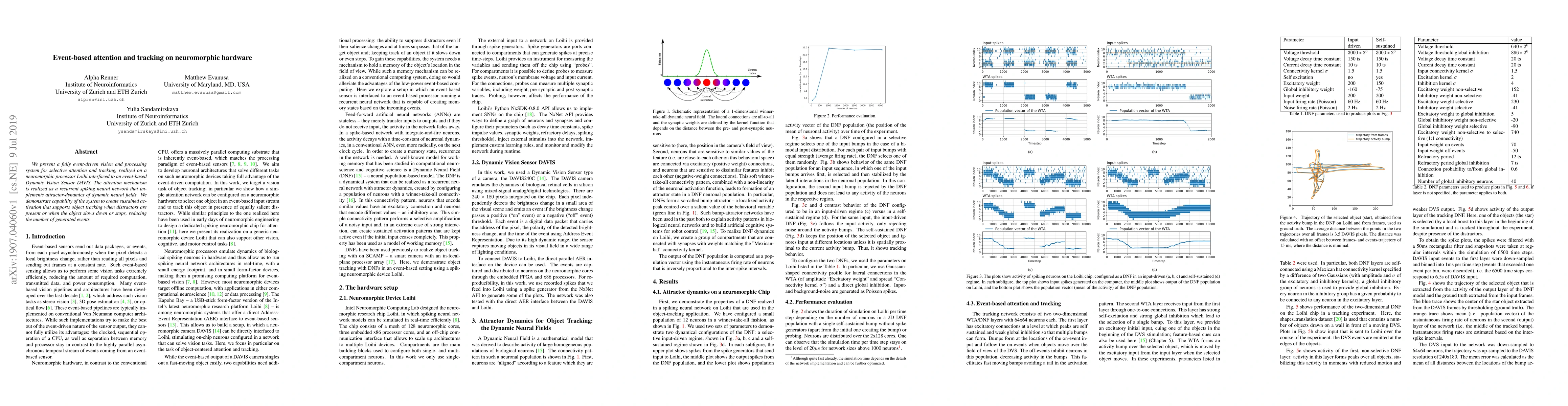 This paper presents an event-driven vision system using neuromorphic hardware for selective attention and tracking, utilizing a recurrent spiking neural network on a Loihi processor connected to an event-based sensor. The system effectively maintains object tracking even amidst distractors and when the object's movement slows or stops.
