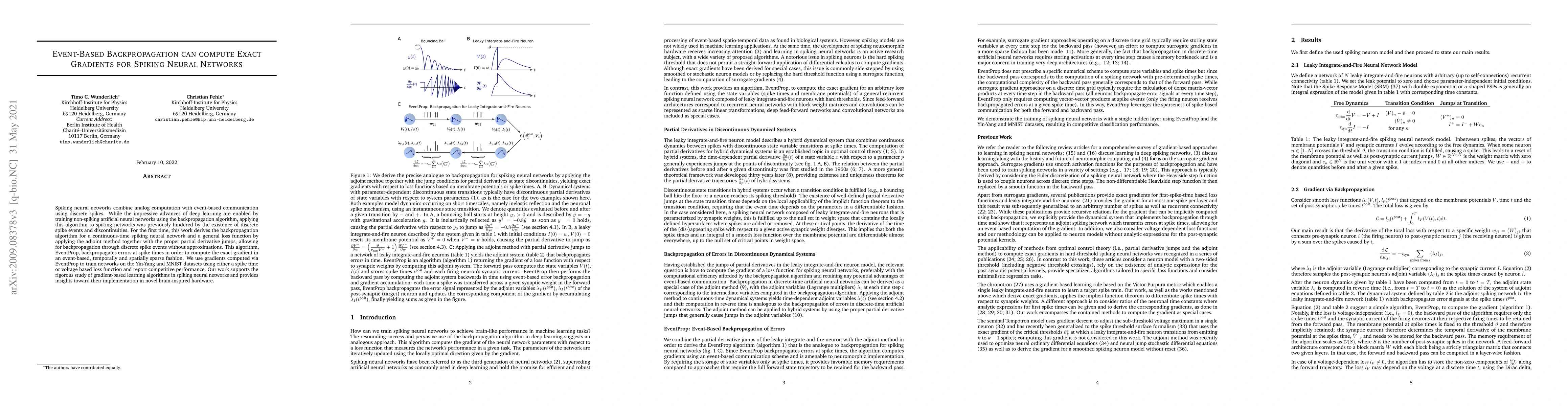 This paper introduces EventProp, an event-based backpropagation algorithm that computes exact gradients for training continuous-time spiking neural networks, overcoming previous challenges posed by discrete spike events. The method demonstrates competitive performance on Yin-Yang and MNIST datasets, supporting the study of gradient-based learning in brain-inspired hardware.