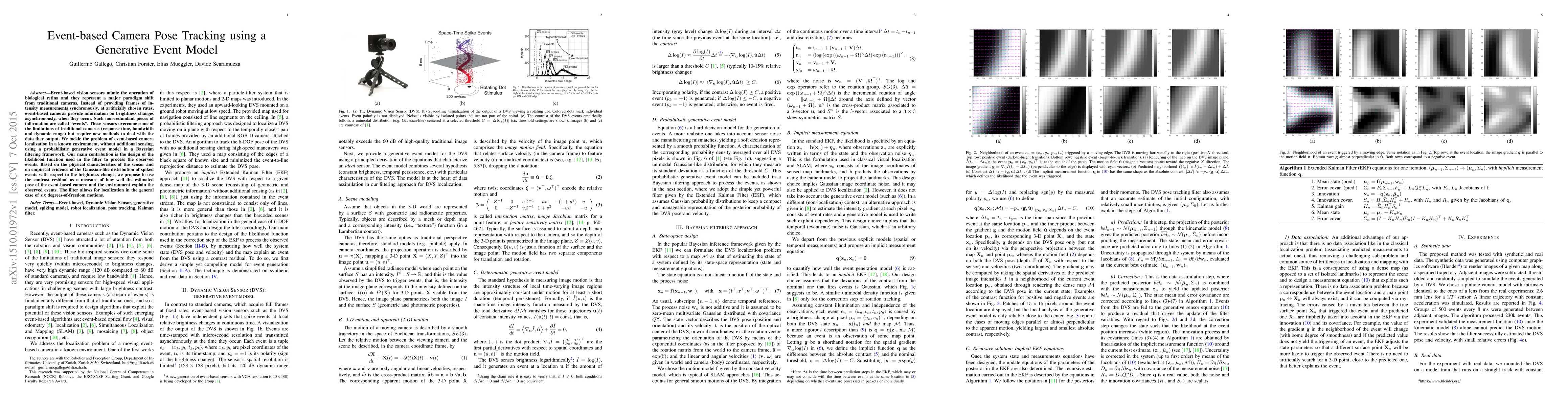 Event-based vision sensors mimic the operation of biological retina and they represent a major paradigm shift from traditional cameras. Instead of providing frames of intensity measurements synchronously, at artificially chosen rates, event-based cameras provide information on brightness changes asynchronously, when they occur. Such non-redundant pieces of information are called "events". These sensors overcome some of the limitations of traditional cameras (response time, bandwidth and dynamic range) but require new methods to deal with the data they output. We tackle the problem of event-based camera localization in a known environment, without additional sensing, using a probabilistic generative event model in a Bayesian filtering framework. Our main contribution is the design of the likelihood function used in the filter to process the observed events. Based on the physical characteristics of the sensor and on empirical evidence of the Gaussian-like distribution of spiked events with respect to the brightness change, we propose to use the contrast residual as a measure of how well the estimated pose of the event-based camera and the environment explain the observed events. The filter allows for localization in the general case of six degrees-of-freedom motions.