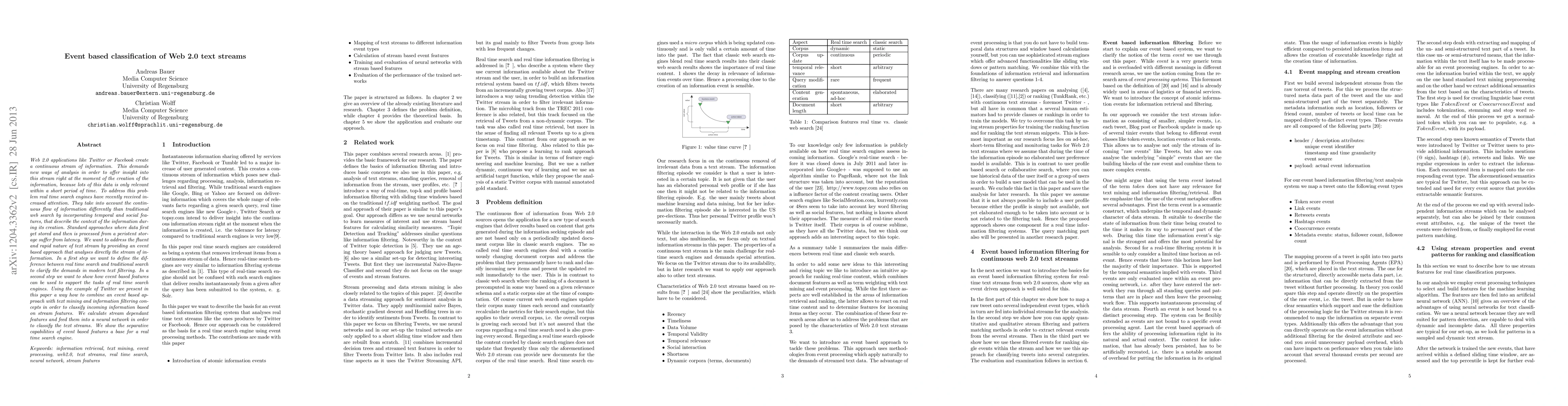 This paper explores an event-based approach for real-time classification of Web 2.0 text streams, contrasting it with traditional search methods. It demonstrates how event-based features enhance real-time search engines by analyzing Twitter streams directly, using neural networks to classify information based on stream-dependent features.